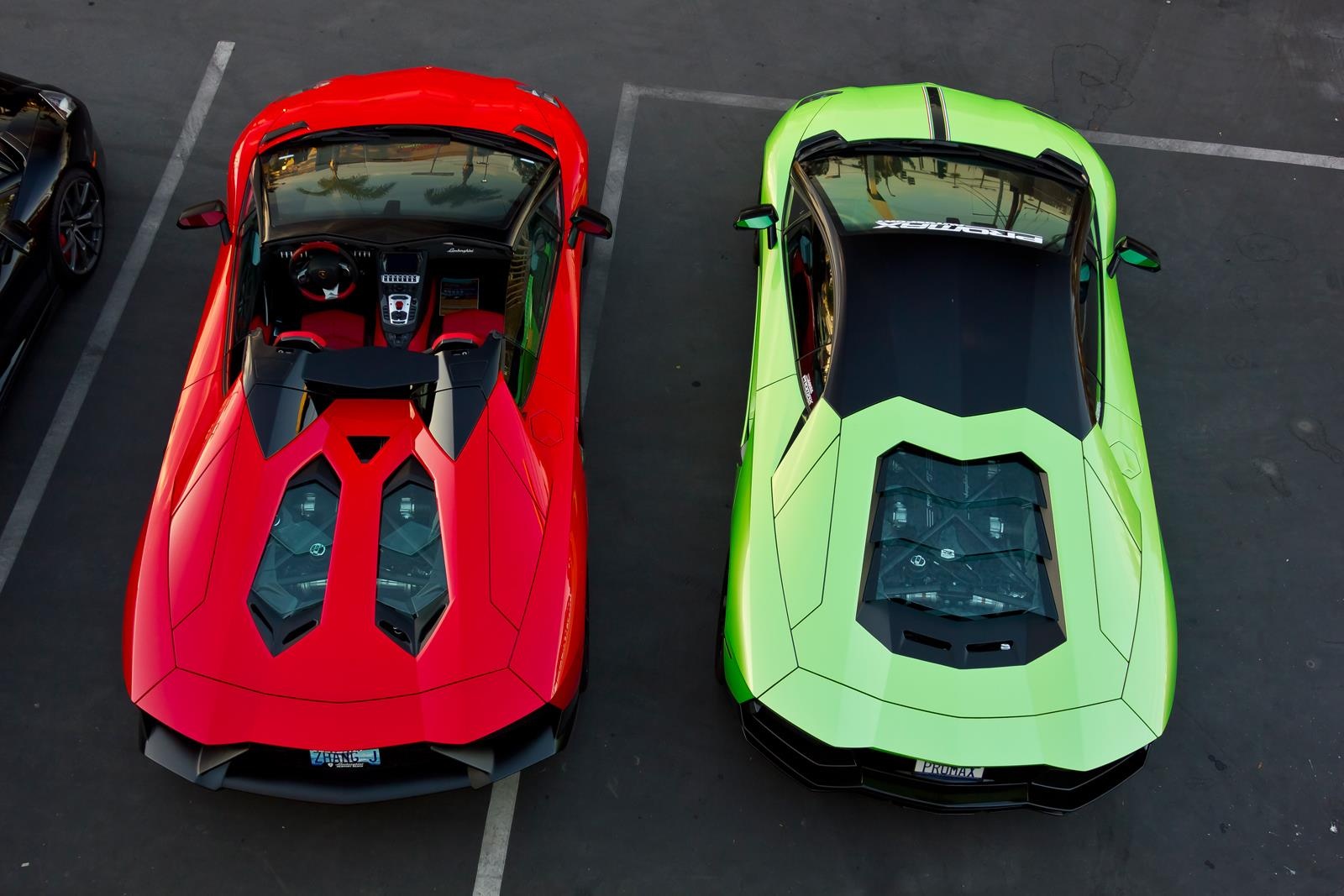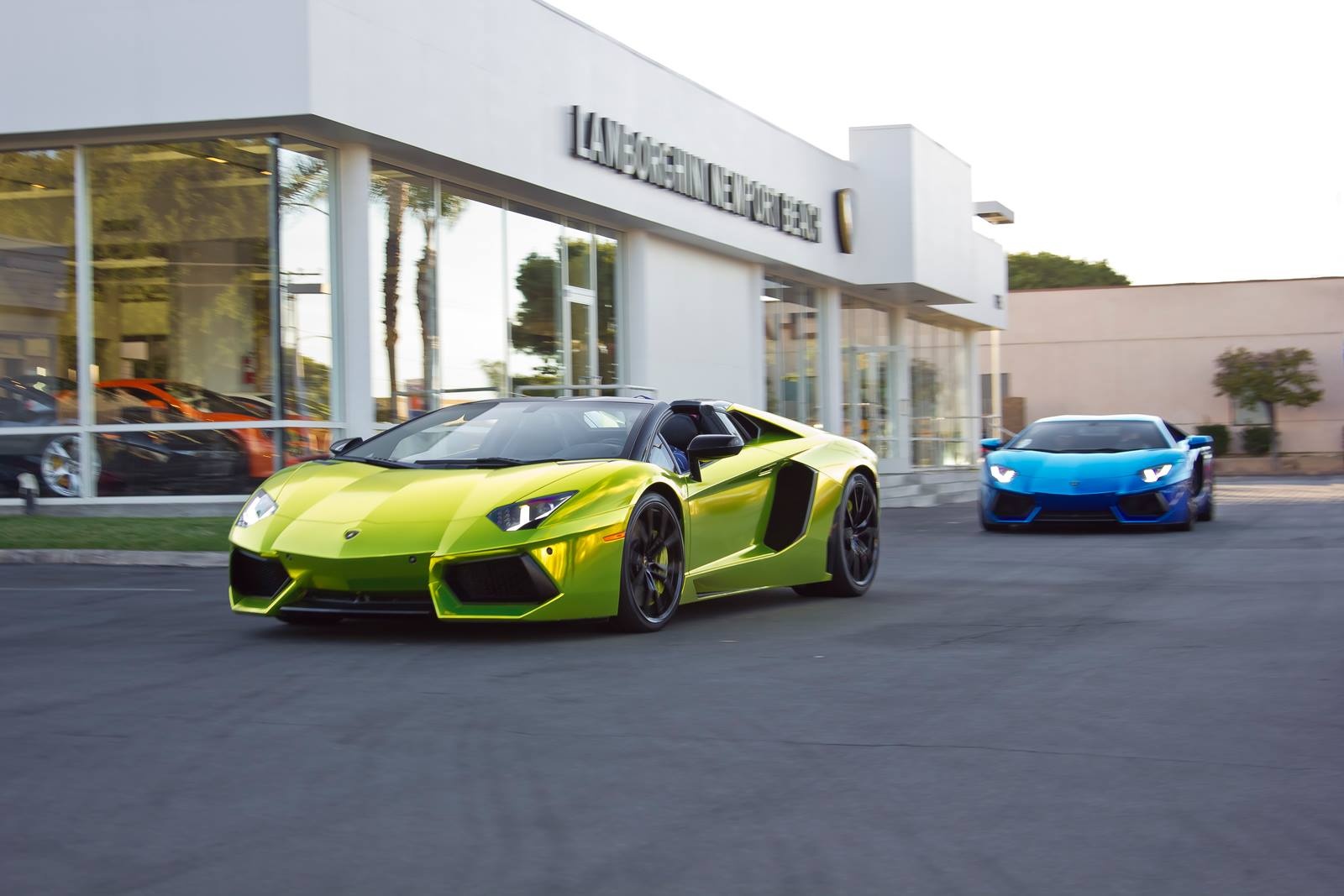 Nổi bật nhất trong số những siêu xe Lamborghini có mặt tại sự kiện là một chiếc Aventador bọc chrome màu xanh lá và một chiếc bọc chrome màu xanh da trời. |