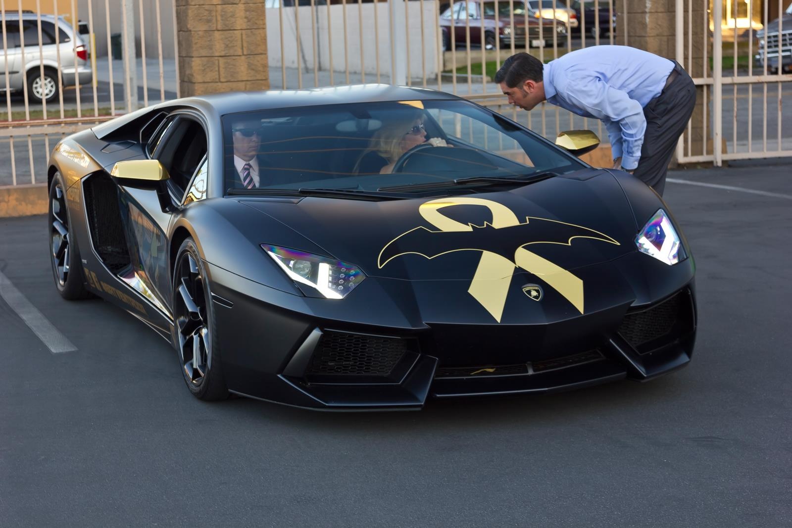 | Siêu xe Aventador màu đen mờ mang biểu tượng Batman cũng xuất hiện nổi bật tại sự kiện này. |