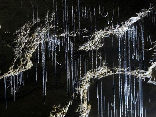 Ánh sáng dịu chiếu vào những dây ấu trùng rủ xuống như pha lê được tạo ra từ loài Arachnocampa luminosa, một loài đom đóm chỉ sống ở New Zealand.