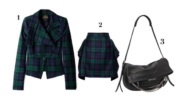 | Áo khoác và váy kẻ trendy của Vivienne Westwood có giá 800 USD kết hợp cùng chiếc túi da kiểu cách 1.650 USD (khoảng 35,1 triệu đồng) của Jimmy Choo. |