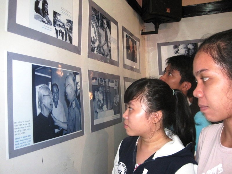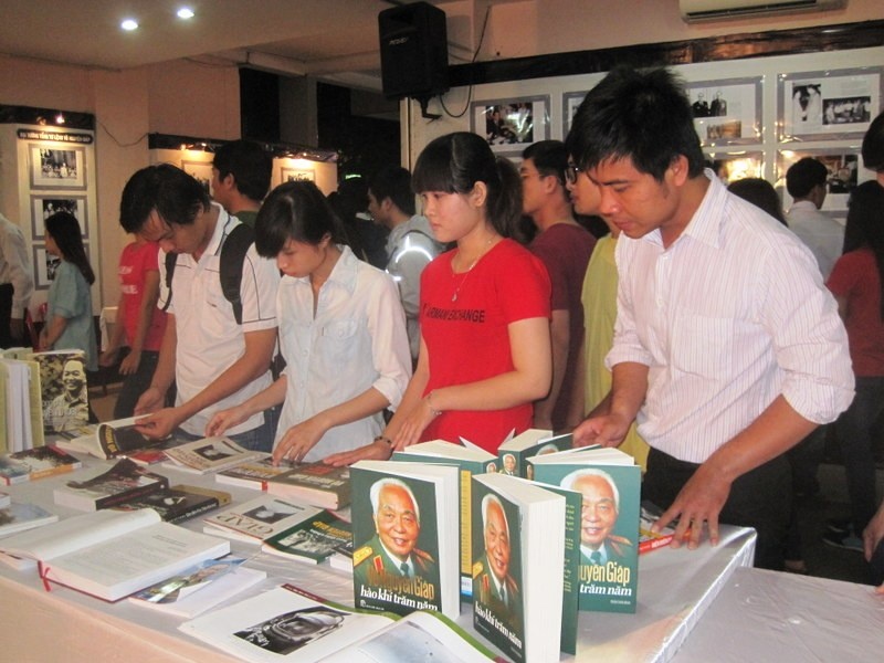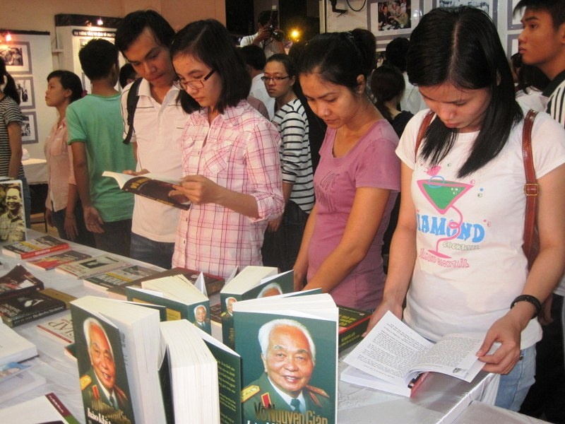 | Các bạn trẻ chăm chú xem những cuốn sách viết về Đại tướng... |