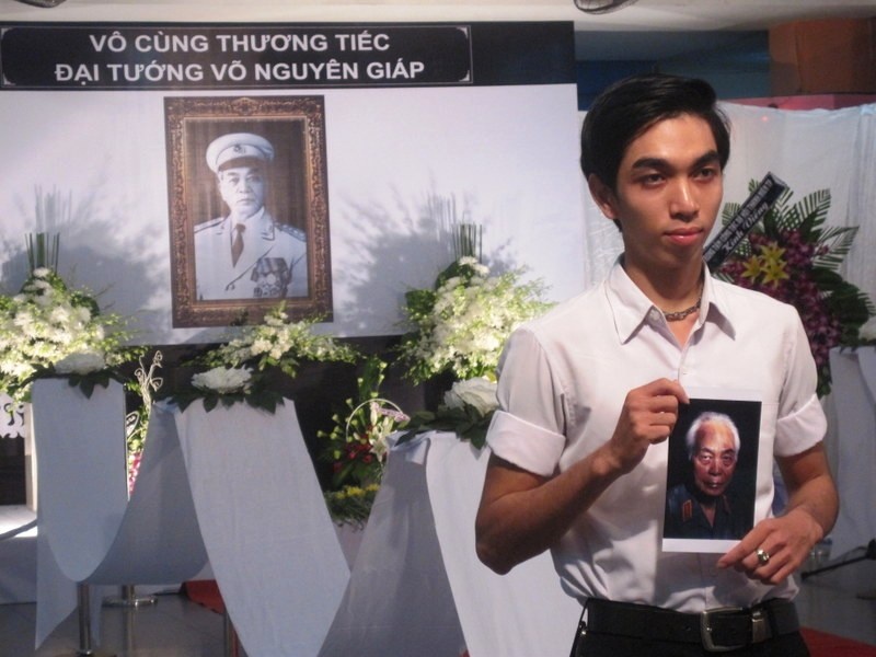 | Bạn Hoàng Mỹ, nhà ở tận Q.Tân Bình cũng đội mưa tới Nhà văn hóa Thanh Niên cùng cầm tấm ảnh Đại tướng. |
