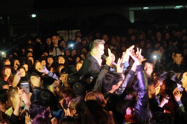 | Anh liên tiếp thể hiện các bản hit quen thuộc của mình như Đợi em trong mơ, Con yêu... và hàng ngàn khán giả có mặt tại sân trường ĐH Vinh liên tiếp hát vang theo. |