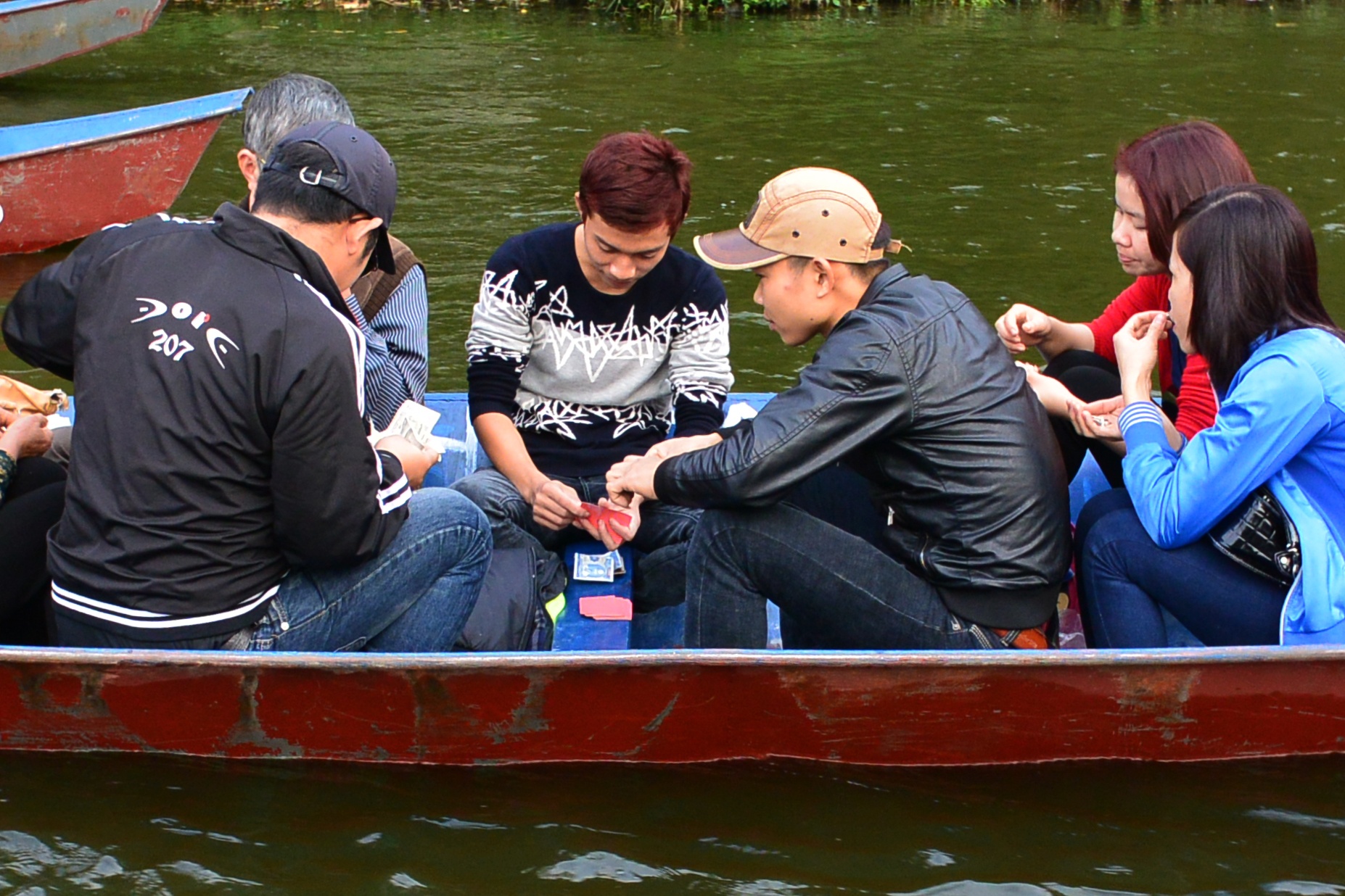 Nhiều nhóm khách tổ chức chơi bài ăn tiền trong thời gian đò di chuyển một tiếng đồng hồ.