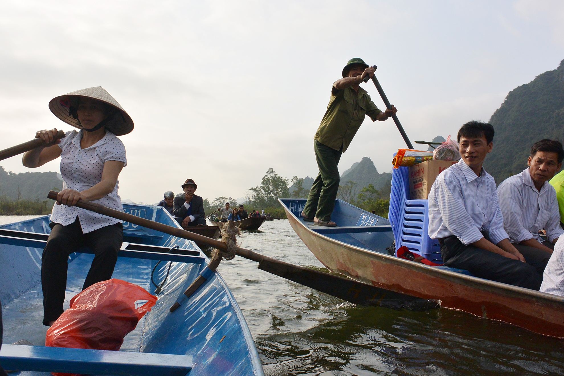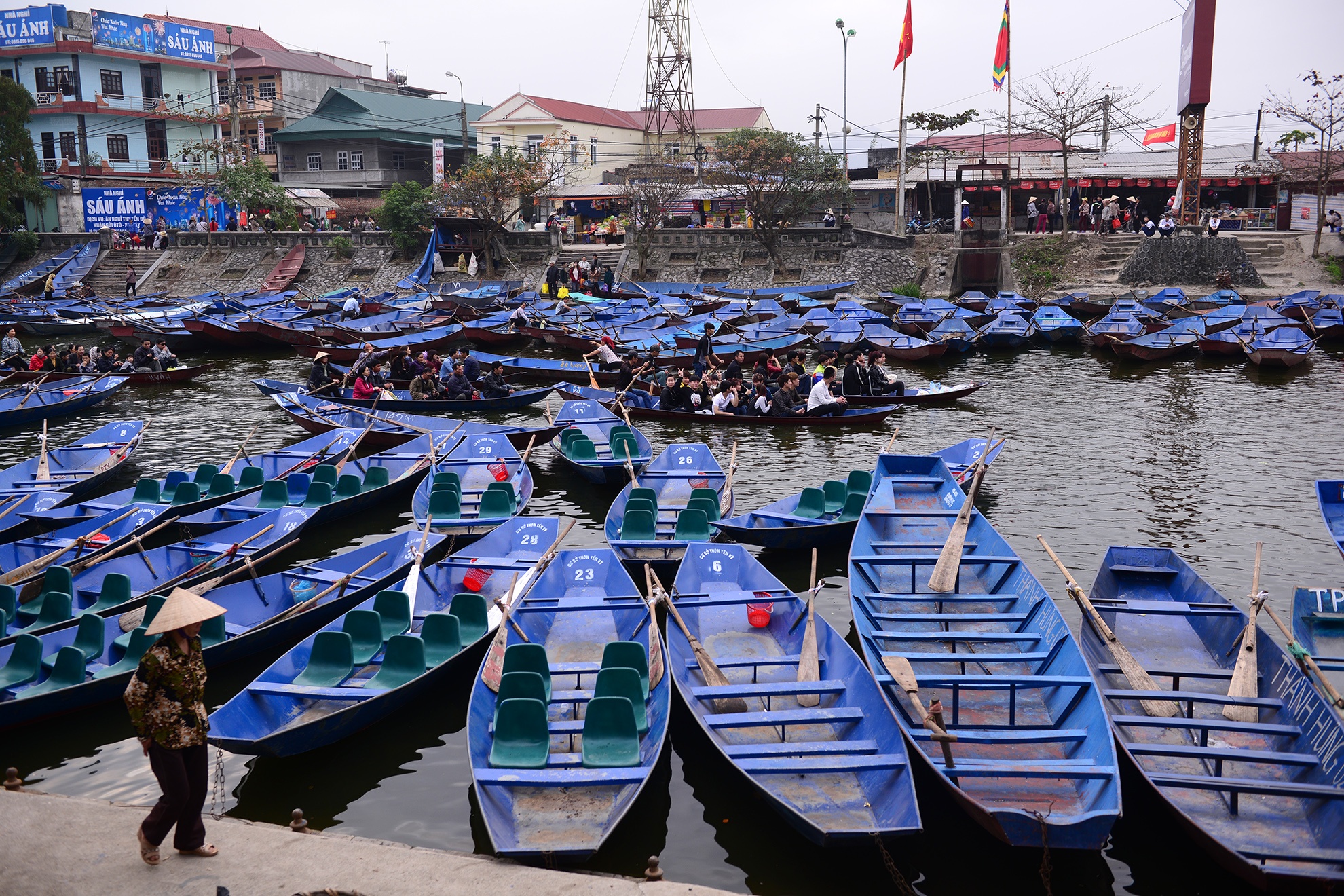 | Chị Thảo (lái đò cho khách của Ban tổ chức lễ hội) cho biết, du khách năm nay trẩy hội chủ yếu trong 5 ngày nghỉ Tết. 'Hôm nay vắng vẻ đáng kể so với mấy ngày đầu năm. Mỗi ngày tôi chở được hai lượt, thu về khoảng 400.000 đồng', chị cho hay. |