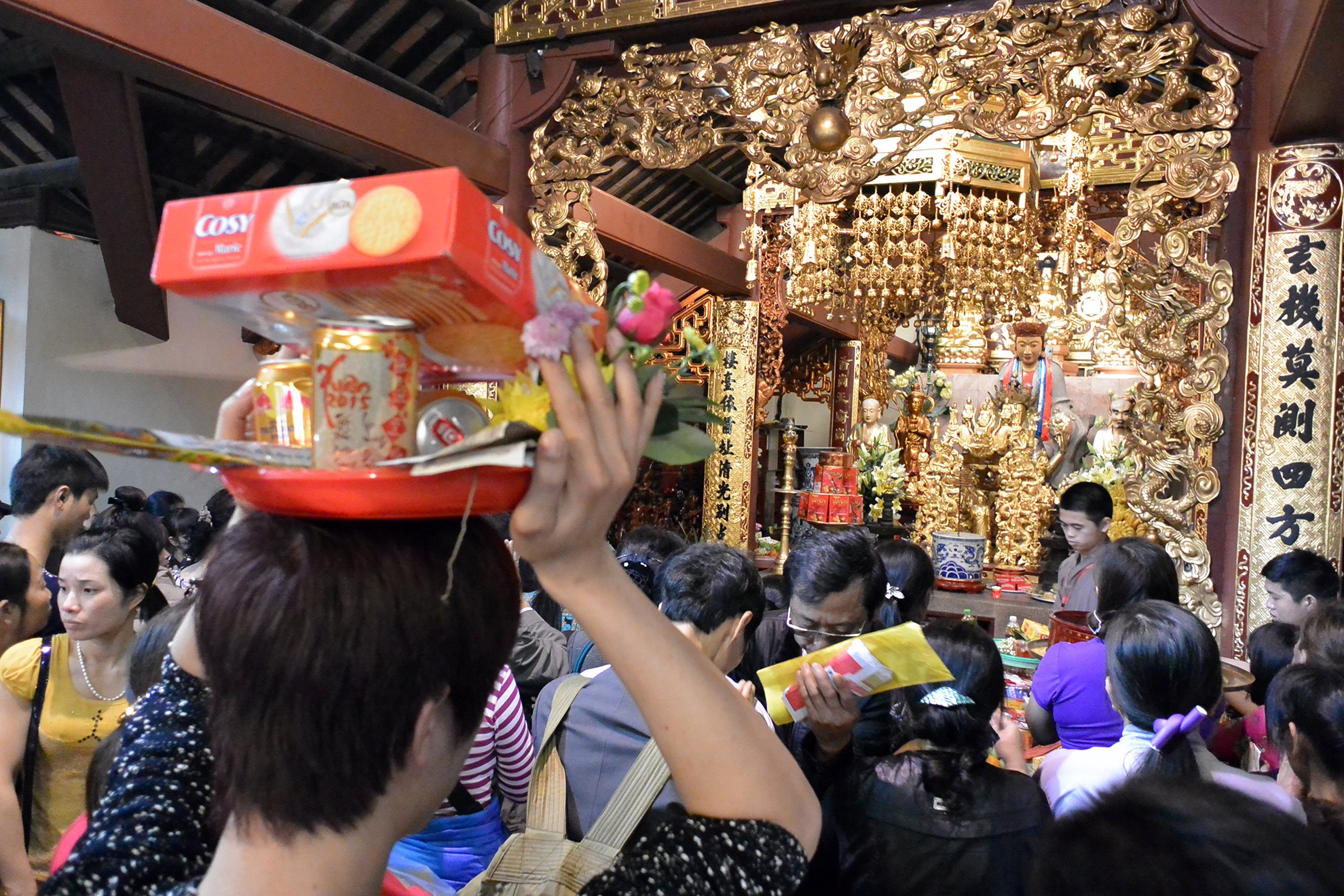 | Bên trong các gian thờ, đồ lễ để chật cứng. |