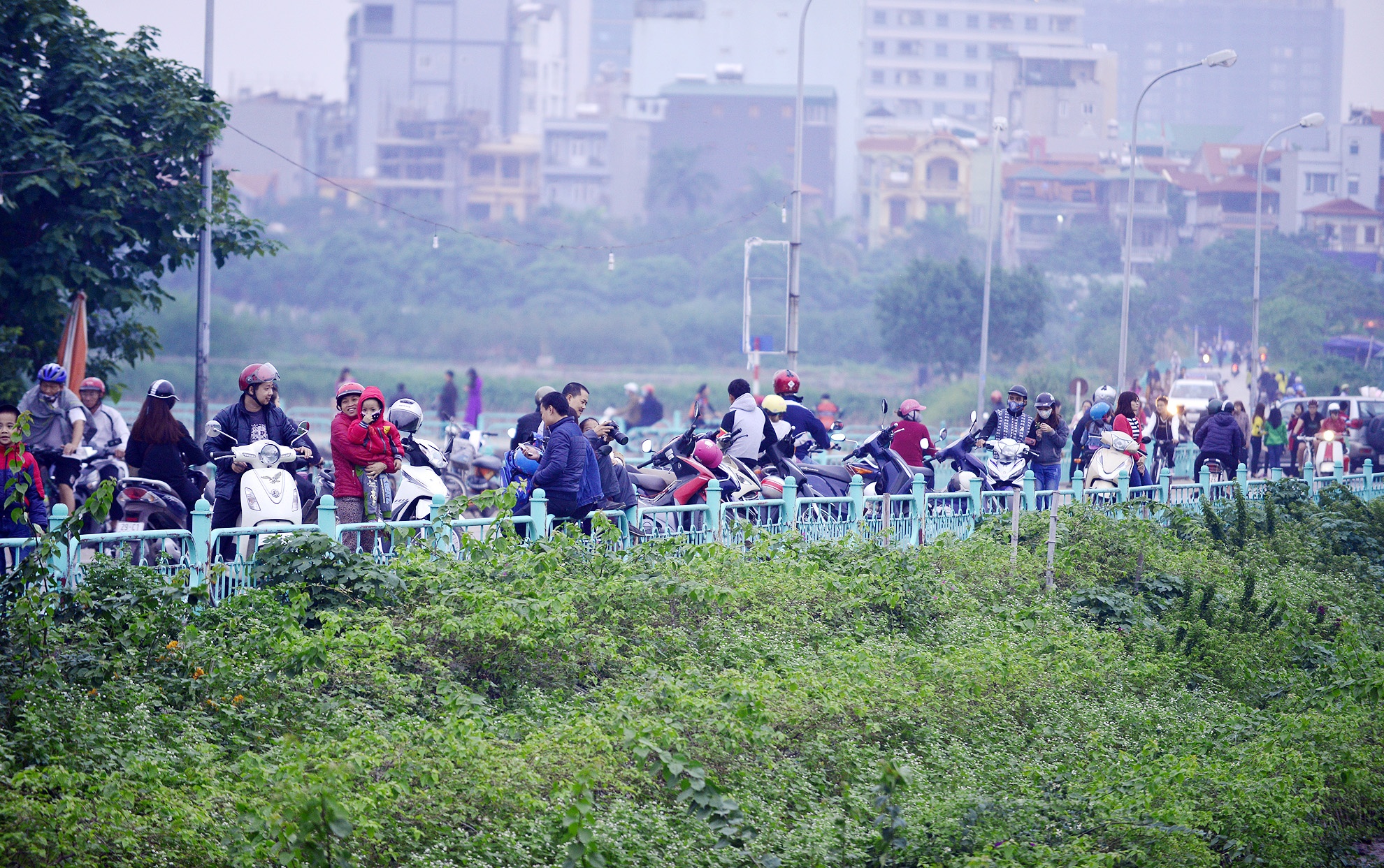 Phía trên đường Nhật Chiêu (ven Hồ Tây), xe máy để la liệt.