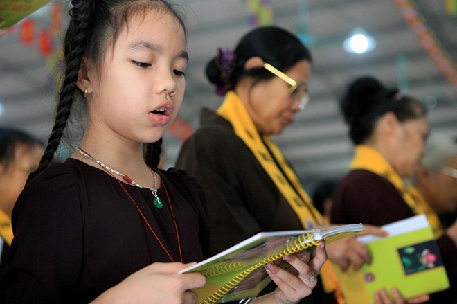 | Các em nhỏ cũng tham gia vào đọc kinh, khấn vái. |