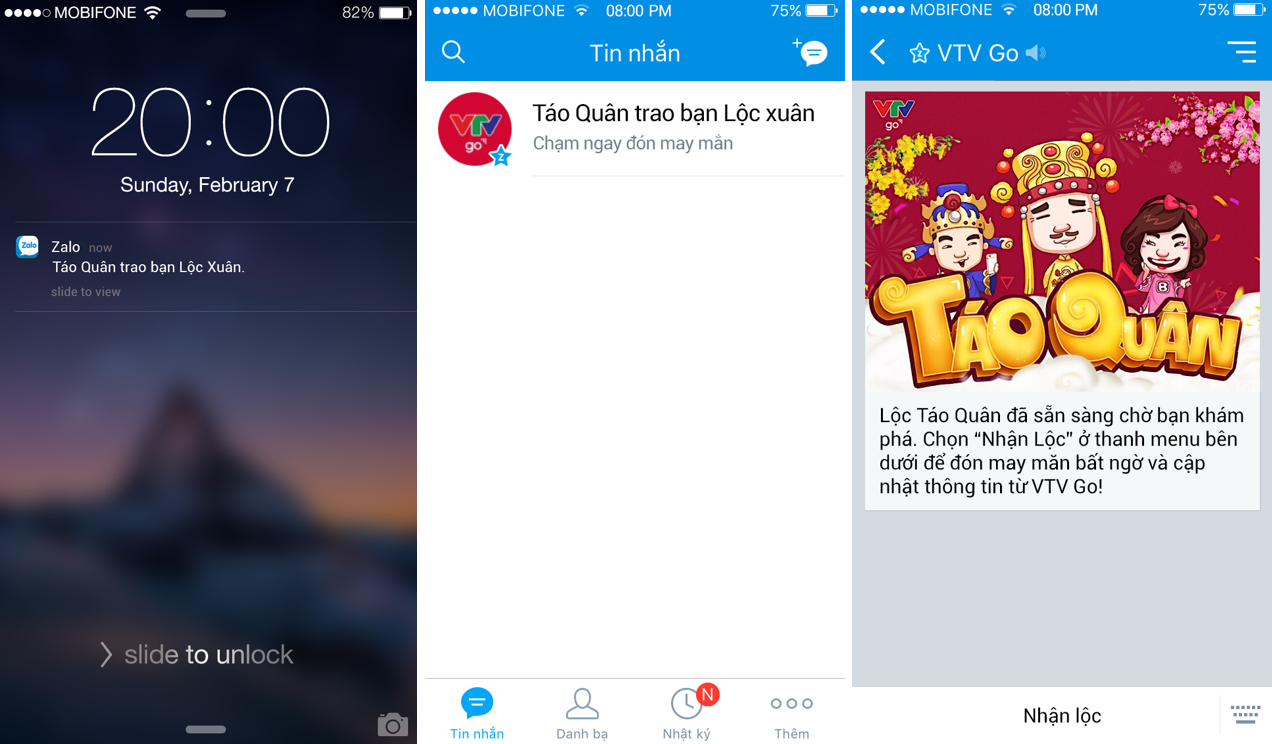 “Táo quân trao bạn lộc xuân, chạm ngay đón may mắn” là tin nhắn Zalo mà khán giả Táo quân 2016 nhận được trong lúc đang xem chương trình trên kênh truyền hình VTV hoặc website VTV Go. Mở tin nhắn đó, người dùng thấy một overlay sticker hiện ra, gửi đến người xem những món lộc xuân thú vị. Lộc có thể là hình ảnh chúc Tết độc đáo từ chương trình, voucher mua hàng trên Tiki (từ 20.000 đồng đến 20 triệu đồng), mã điện thoại (mệnh giá từ 10.000 đồng đến 500.000 đồng) và lì xì từ Ví MoMo (bao gồm tiền vào tài khoản Ví MoMo và cặp voucher mua vé xem phim và thanh toán hoá đơn điện lực TP HCM).