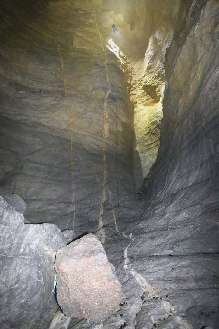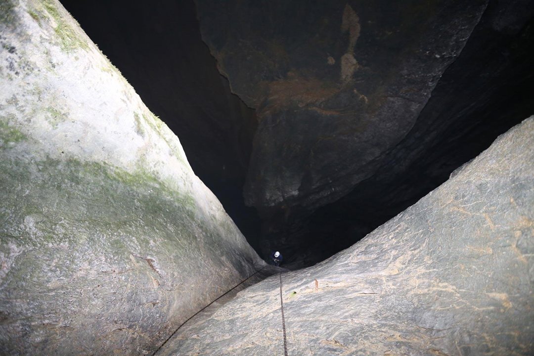 Lần thứ nhất, chàng trai Hà thành đi tiền trạm với sự giúp đỡ của một thanh niên bản địa gốc Hoa. Xuống tới 80 m, anh đành bỏ dở vì không mang đủ dây. |