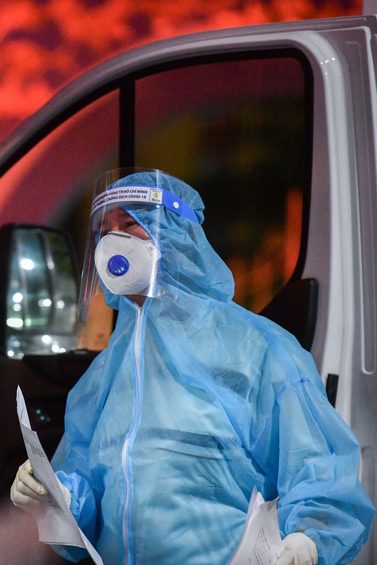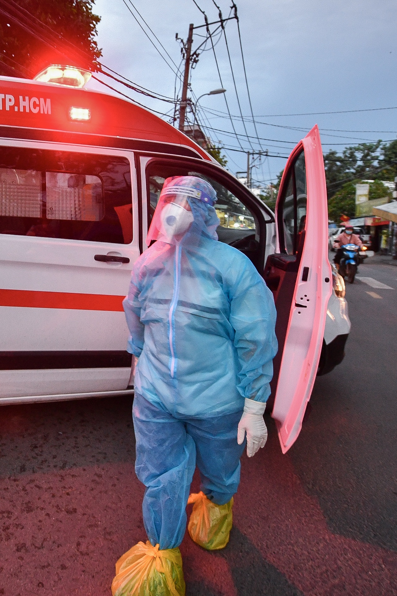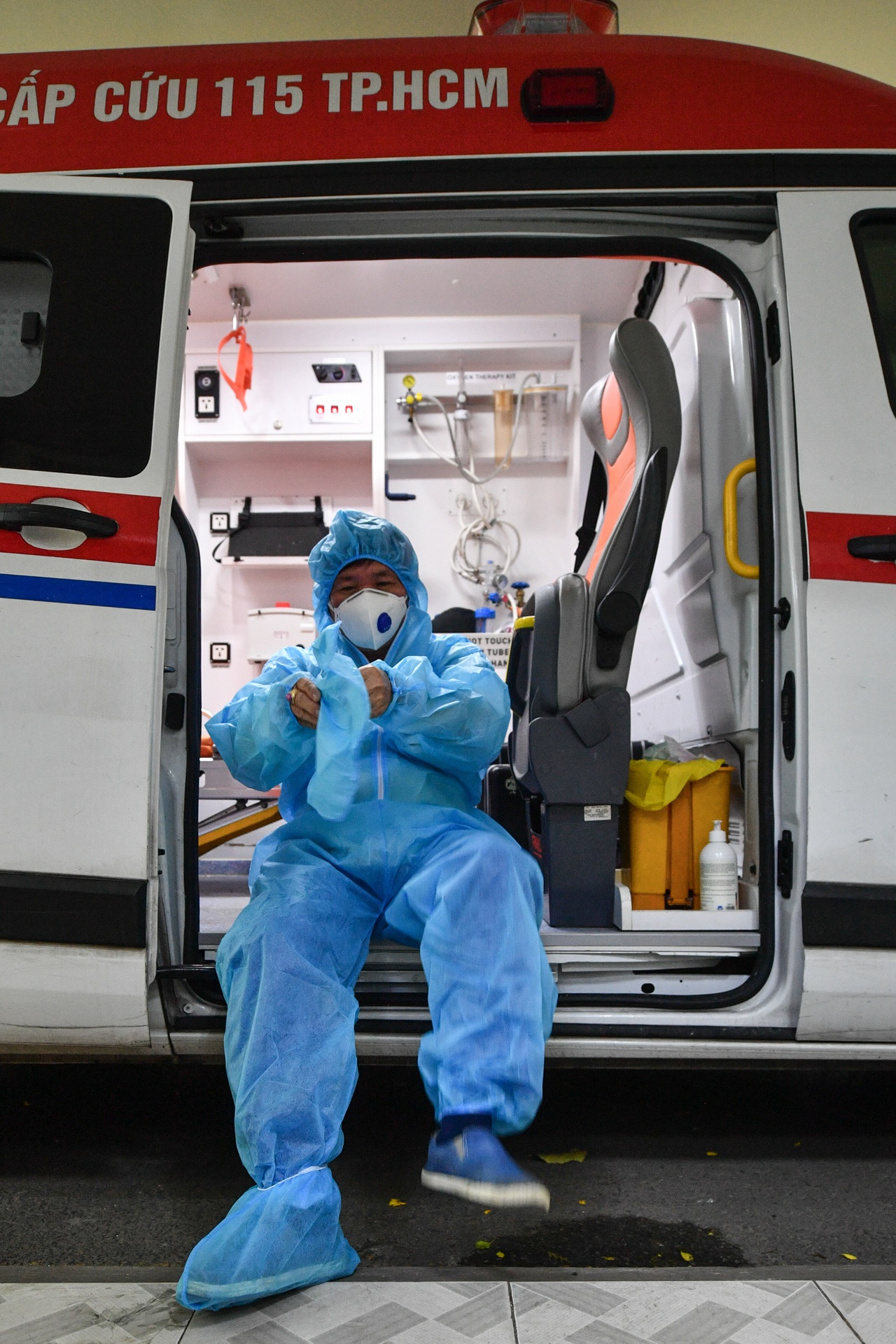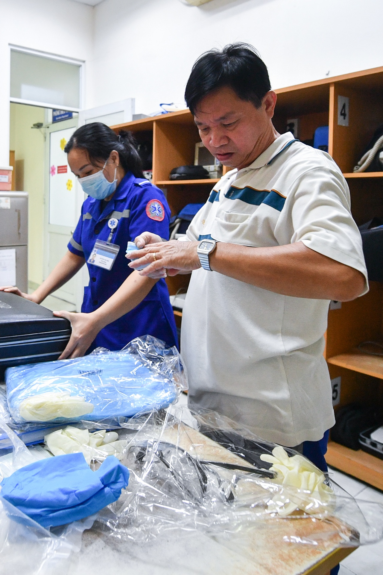 | Hôm nay, sau 2 chuyến chở F0, 17h, tôi phụ trách chuyến cấp cứu đón 6 ca dương tính từ trung tâm thành phố đến Bệnh viện điều trị Covid-19 Cần Giờ. Tôi cùng các đồng nghiệp chuẩn bị đồ bảo hộ, dụng cụ trước khi đi. |