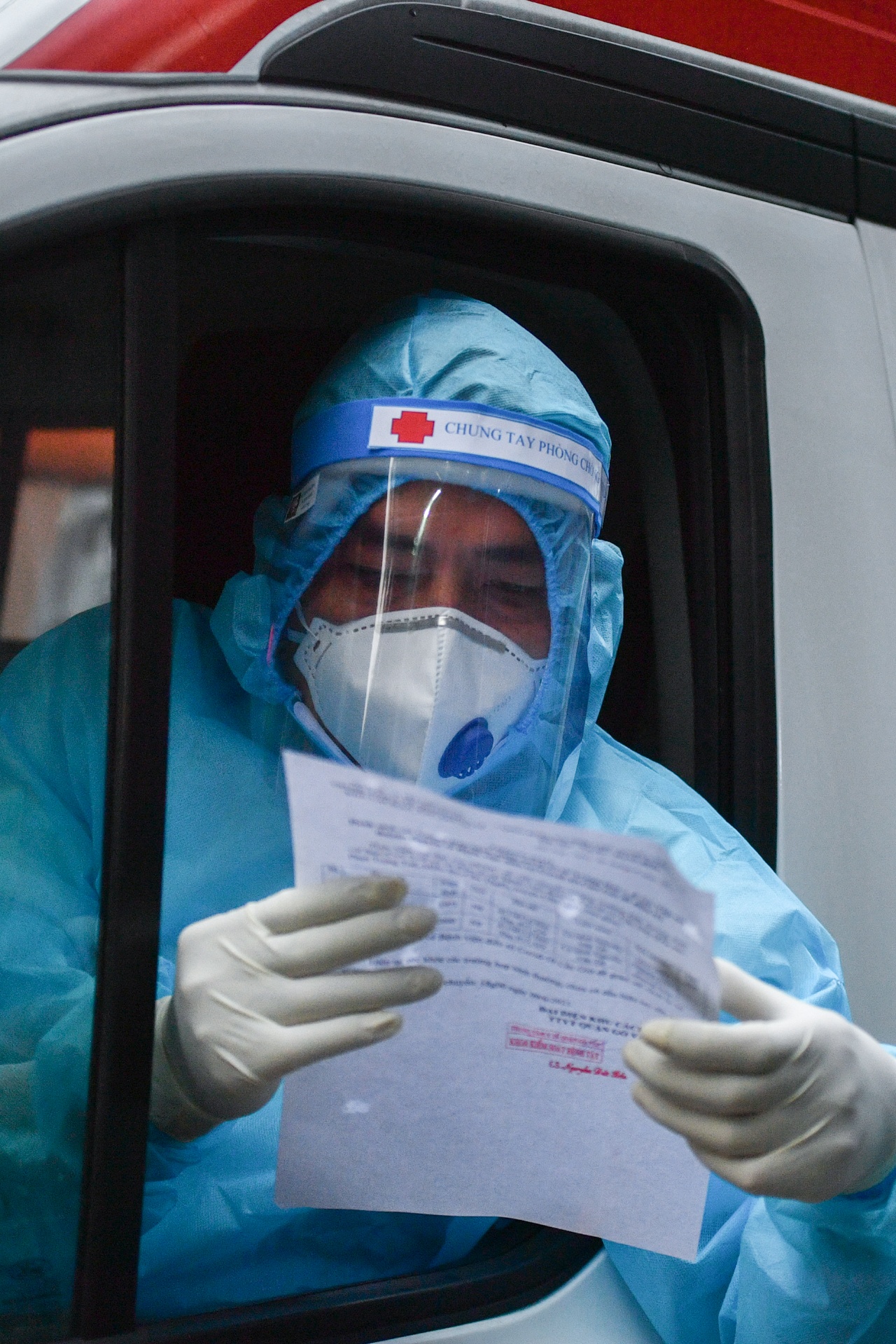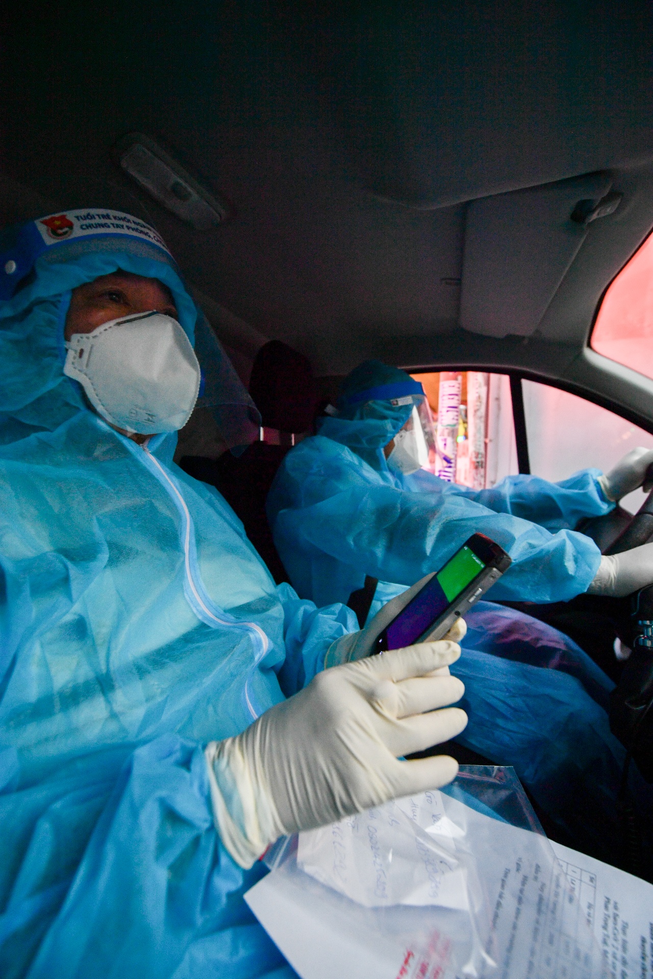 | Tài xế Nguyên gặp nhân viên y tế, đưa giấy tờ để làm thủ tục bàn giao những người ca F0 vào bệnh viện. |