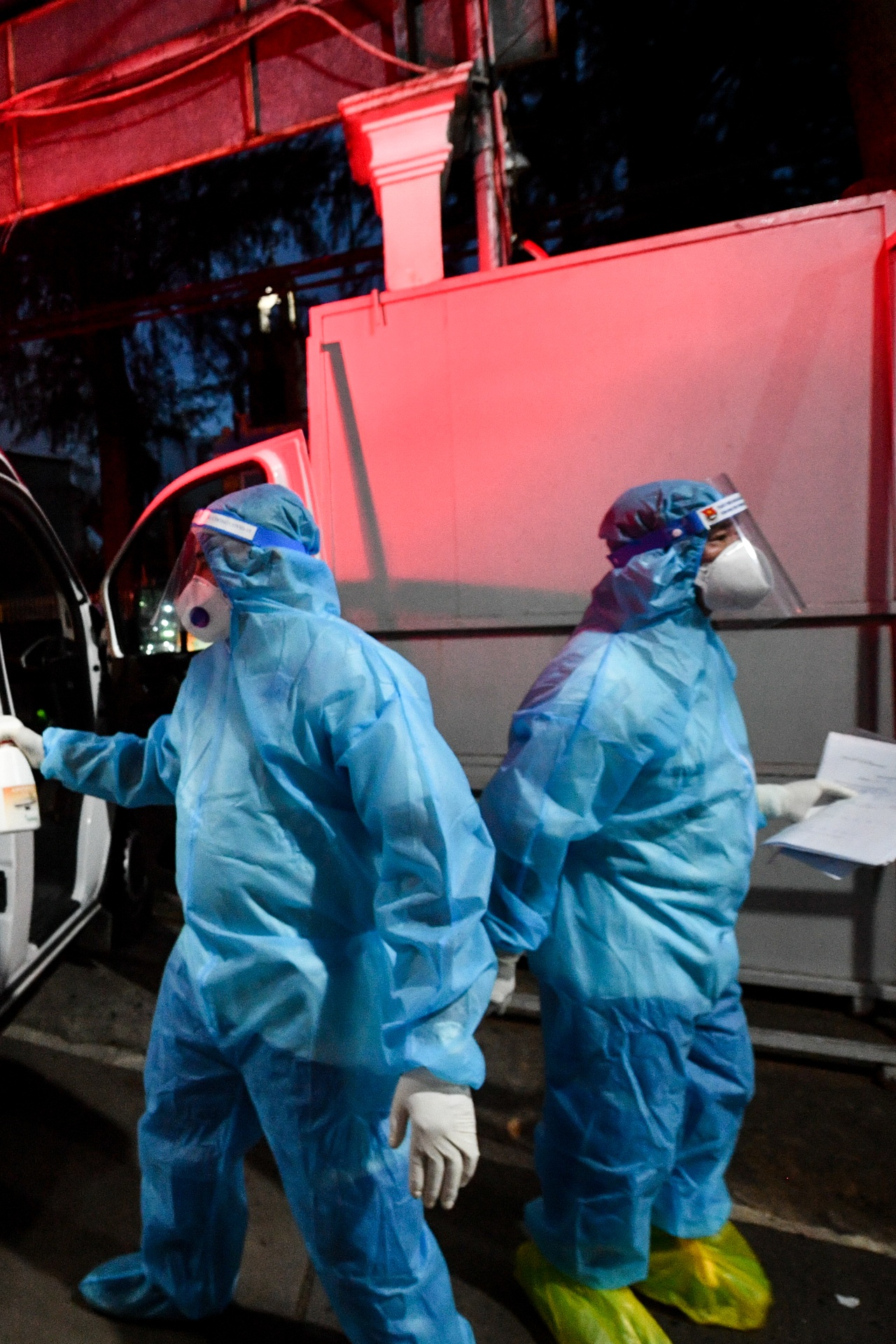 | Theo quy định, các bệnh nhân khi được xe cấp cứu đến chuyển đi phải mặc bảo hộ 100%. Nhiều người mặc đồ bảo hộ sai quy chuẩn hoặc chuẩn bị chưa đủ giấy tờ nên chúng tôi phải chờ khá lâu. |