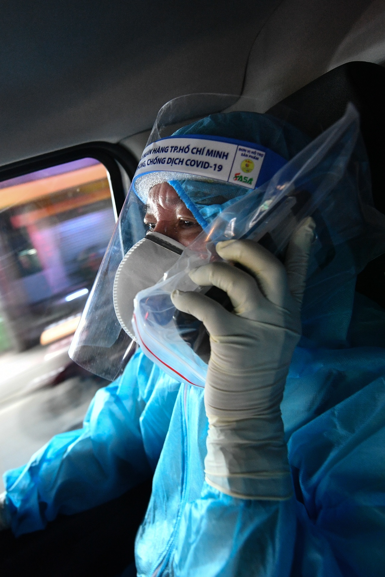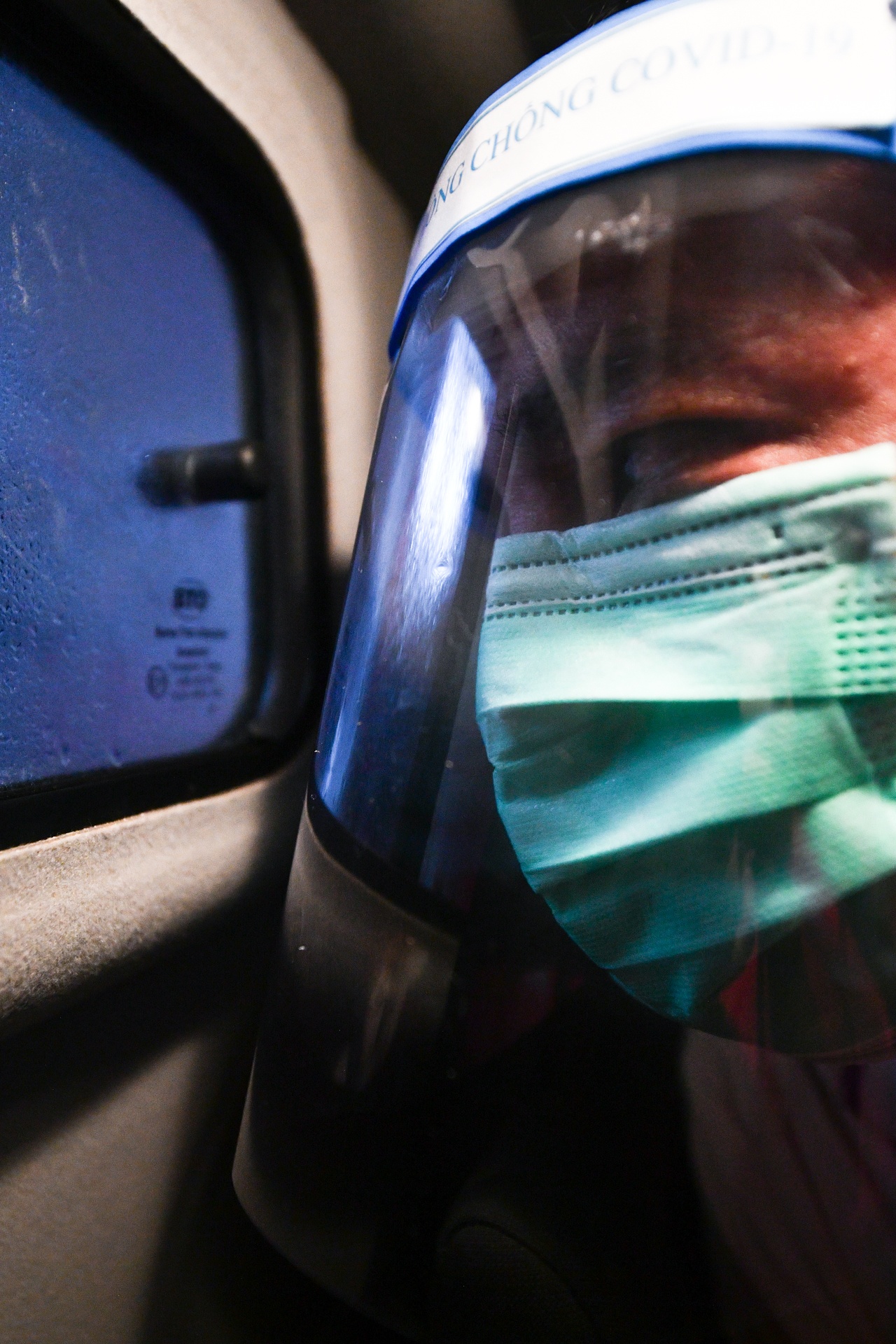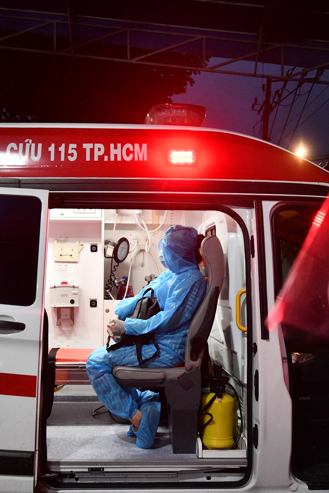 | Tôi sẽ đi cùng tài xế Khôi Nguyên trong chuyến này, cả hai đều chuẩn bị thật kỹ đồ bảo hộ. Vì là xe chuyển ca bệnh nên chúng tôi cần hạn chế người ngồi bên trong, chỉ có một nhân viên y tế và một tài xế. |
