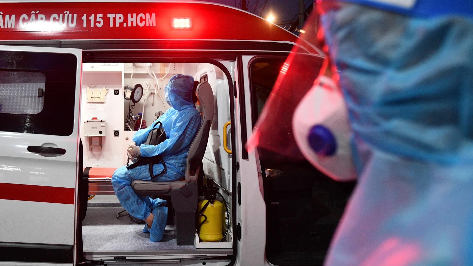 | Tôi là điều dưỡng Trần Ngọc Sang thuộc Trung tâm Cấp cứu 115 TP.HCM, bên phải tôi là tài xế Võ Lâm Khôi Nguyên. Khi dịch Covid-19 tại TP.HCM diễn biến phức tạp, ngoài công việc cấp cứu thông thường, chúng tôi còn hỗ trợ đưa các ca dương tính đến nơi cách ly, điều trị. |