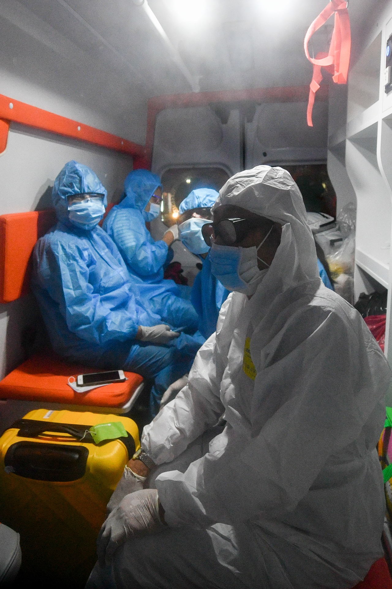 | Cả 6 bệnh nhân này đều khá khoẻ mạnh, tỉnh táo. Tuy nhiên, gương mặt ai cũng toát lên vẻ căng thẳng khi ngồi phía sau xe cấp cứu. |