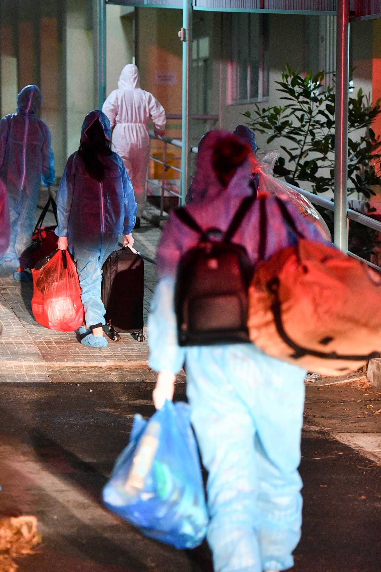 | Bệnh nhân xếp hàng giãn cách, được phun khử khuẩn toàn thân và hành lý trước khi bước vào khu cách ly. Tôi yên tâm khi nhìn các bệnh nhân đến nơi điều trị an toàn mà không gặp sự cố nào về sức khỏe. |