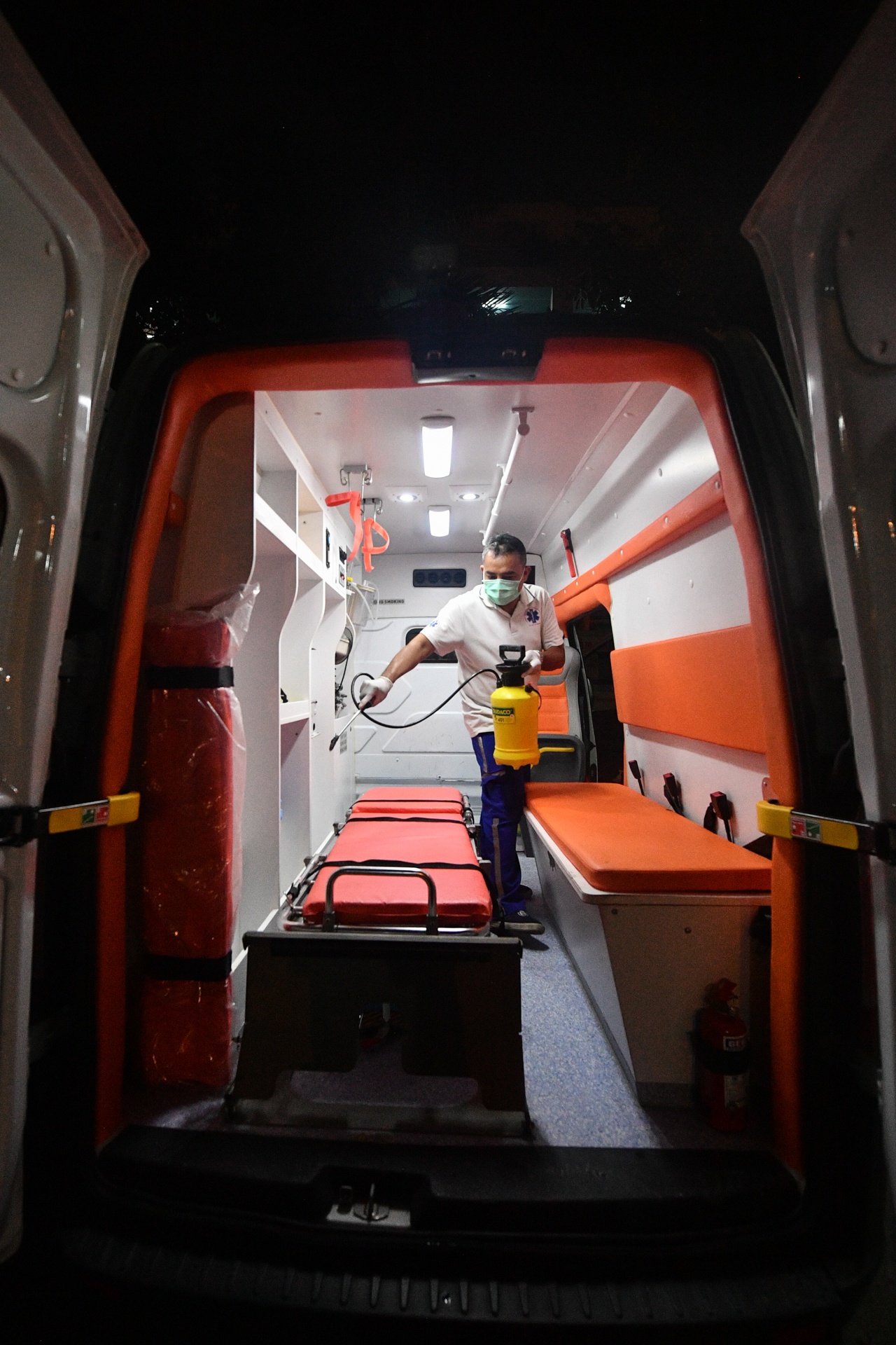 | Công việc của anh Nguyên sau mỗi chuyến chở bệnh nhân là khử khuẩn toàn bộ xe. |