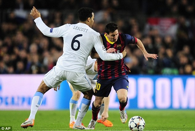 | Hầu như tất cả các cầu thủ của Man City đều tìm cách ngăn chặn những pha đi bóng của Messi. |