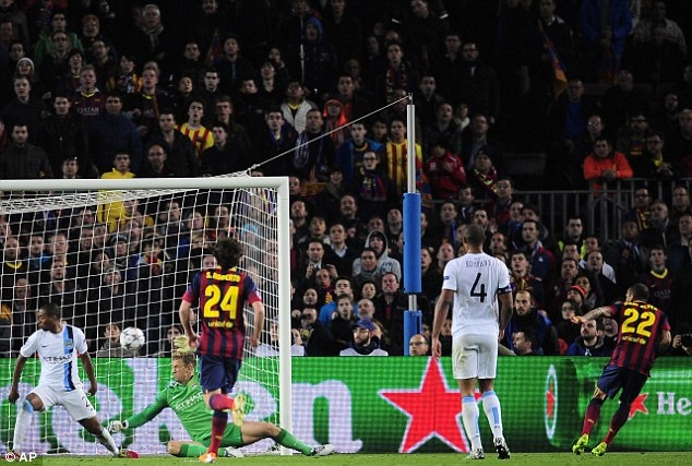 | Alves ghi bàn ấn định chiến thắng 2-1 cho Barca sau khi Kompany đem về bàn thắng danh dự cho Man City. |