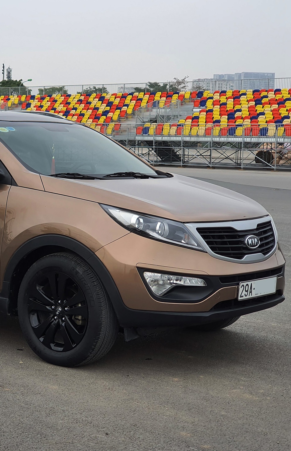 | Vốn không thích màu đen, tôi đã sơn lại la-zăng sang màu trắng. Kia Sportage 2011 có kích thước chiều dài 4.440 mm, chiều rộng 1.885 mm, chiều cao 1.635 mm. Xe được trang bị hộp số tự động 6 cấp, động cơ xăng 4 xy-lanh thẳng hàng DOHC dung tích 2.0 lít, phun xăng đa điểm điện tử. |