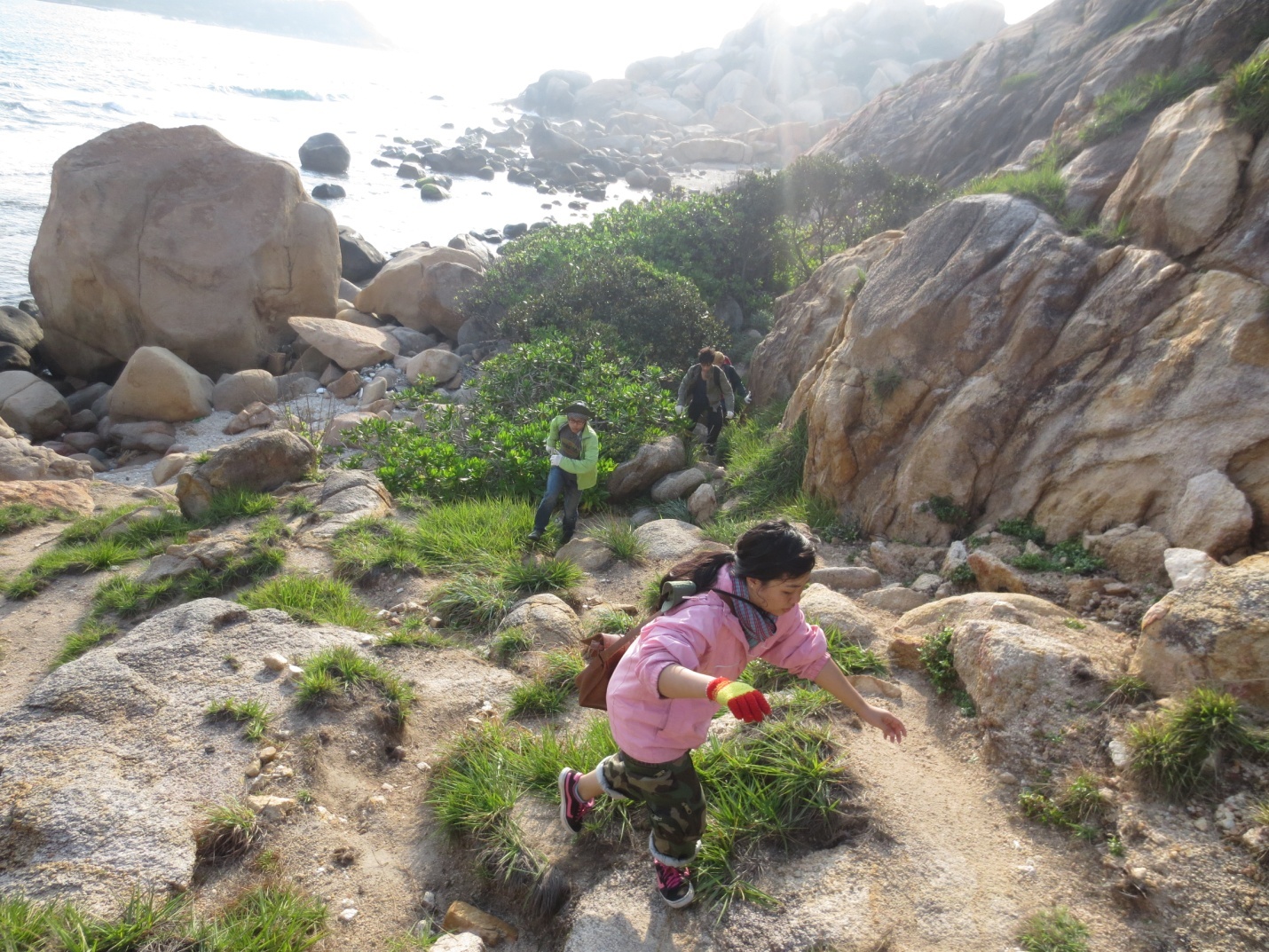 Rạng sáng, trời âm u và mây nhiều, nên đến 5h, chúng tôi mới xuất phát từ bãi Rạng sang Mũi Đôi. Cả đoàn rất háo hức đón được ánh bình minh tại cực Đông. Hết màn leo núi, lội cát, giờ đã đến trận nhảy đá. Tôi đã đi qua nhiều con đường, nhưng đây là lần đầu tiên chúng tôi đi qua con đường hẹp như vậy, chỉ vừa 1 người. Có thể nói, do trời tối, “điếc không sợ súng”, không biết mọi thứ quanh mình, chúng tôi vượt qua mọi gian lao rất nhanh.