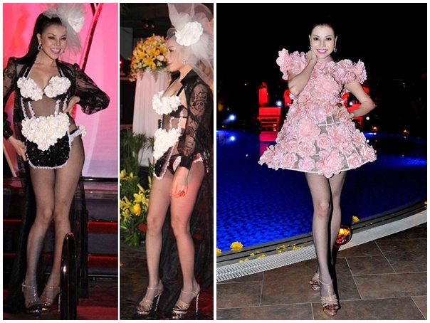 Trà Ngọc Hằng: Khi mới gia nhập làng giải trí Việt, Trà Ngọc Hằng để lại những ấn tượng không mấy đẹp đẽ về gu thời trang rườm rà, sến sẩm, thậm chí còn phản cảm. Với những bộ cánh khó hiểu, không phù hợp xu hướng chung, người đẹp nhanh chóng góp mặt ở những bình chọn mặc xấu nhất năm trong những năm 2010-2012. Trong ảnh là trang phục trình diễn khiến Trà Ngọc Hằng nhận không ít chê bai từ công chúng.