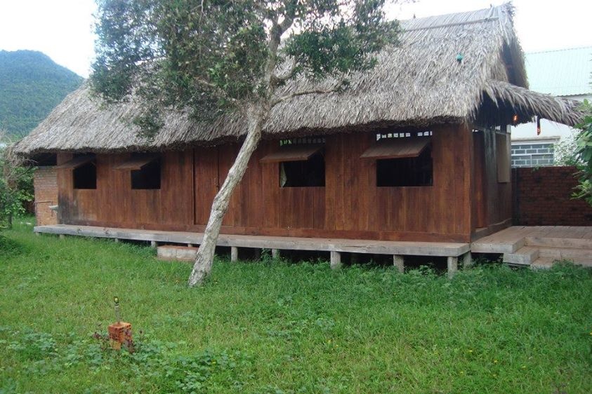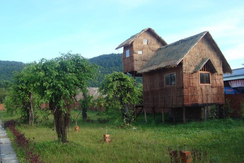 | Khung ảnh khách sạn nơi cả đoàn nghỉ dưỡng với nhà tranh, nhà sàn, vườn cây. |