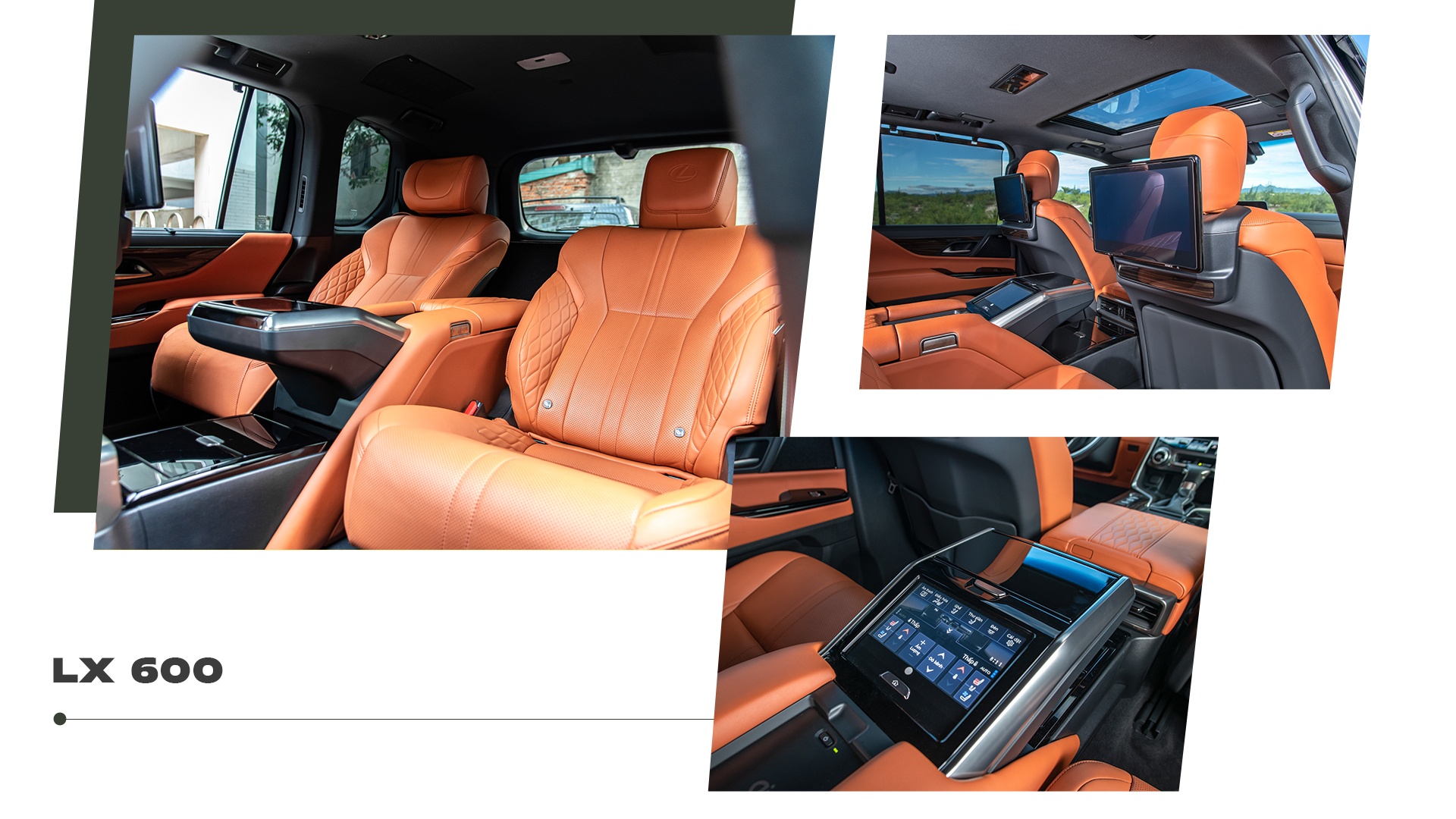 Trong đó, phiên bản VIP của LX 600 được trang bị ghế ngồi hạng thương gia, với tựa đầu kích thước lớn và có khả năng chỉnh điện. Hàng sau sở hữu 2 ghế thương gia, nhưng LX 600 sẽ chỉ có duy nhất một ông chủ, nên mọi ưu tiên đều nằm ở bên phải. Chỗ ngồi của các VIP sở hữu khoảng để chân rộng tối đa tới 1,1 m. Giữa 2 ghế là một màn hình điều khiển trung tâm, nơi chủ nhân có thể quyết định mọi thứ: Mức nhiệt độ muốn có, bản nhạc muốn nghe, không gian để chân phù hợp và hệ thống massage ưng ý.