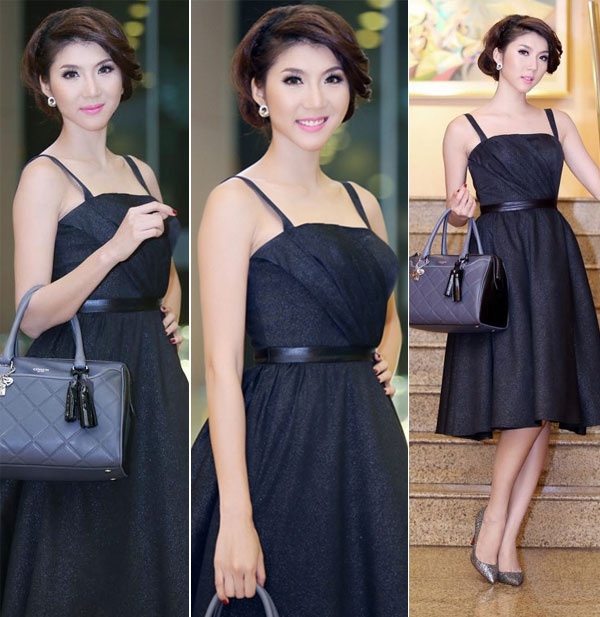 | Chẳng cần phải hở hang nhiều Ngọc Quyên cũng gây chú ý với bộ váy bó sát cơ thể gam màu đen truyền thống. Tóc mái bằng, phụ kiện màu đỏ càng làm cô thêm phần trẻ trung. |