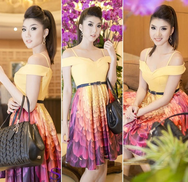 | Trẻ trung và ấm áp với váy gam vàng pha tím. |