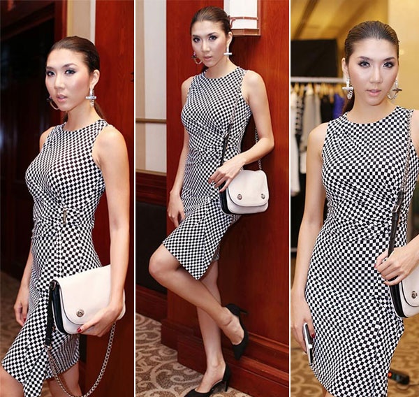 | Bộ váy kẻ caro tạo điểm nhấn tại eo khiến Ngọc Quyên khoe vóc dáng thon thả. Mái tóc đuôi ngựa, đôi bông tai lạ mắt và túi xách cùng gam màu càng tạo nên cho cô sự hài hoà. |