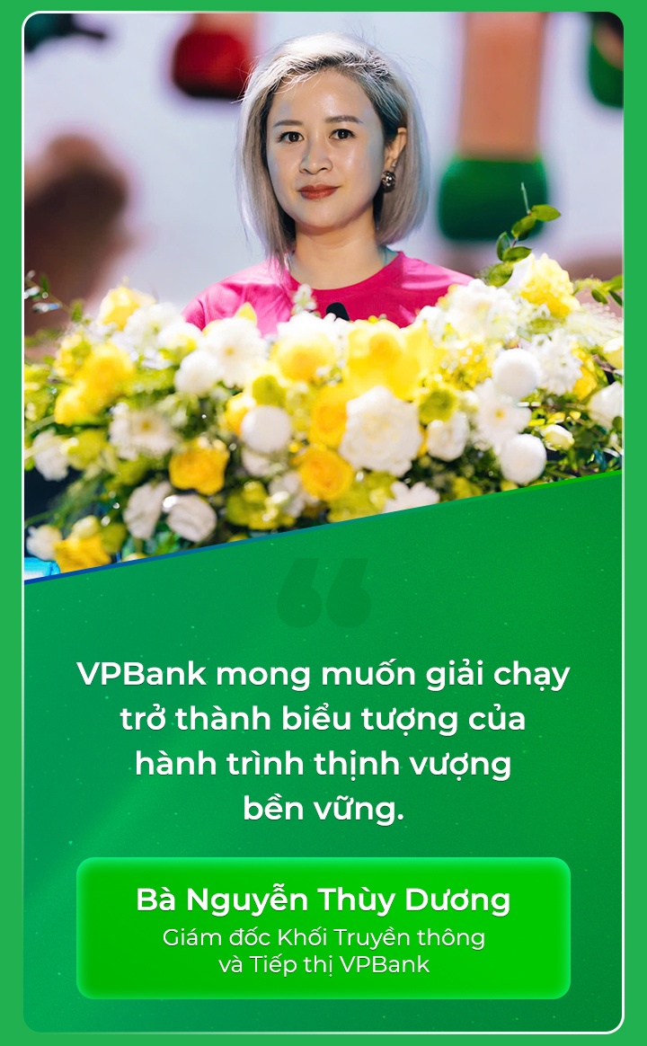 “Chúng tôi mong muốn giải chạy trở thành biểu tượng của một hành trình thịnh vượng bền vững - hành trình bắt đầu từ sức khỏe thể chất, lan tỏa sang tinh thần và gắn kết cộng đồng. Không chỉ tổ chức những giải chạy quy mô lớn trong nước, khát vọng vươn tầm quốc tế của VPBank còn thể hiện ở việc liên tục đưa sự kiện văn hóa nghệ thuật quốc tế về Việt Nam, giúp khán giả tiếp cận gần hơn nữa với thế giới”, bà Nguyễn Thùy Dương - Giám đốc Khối Truyền thông và Tiếp thị VPBank - chia sẻ.