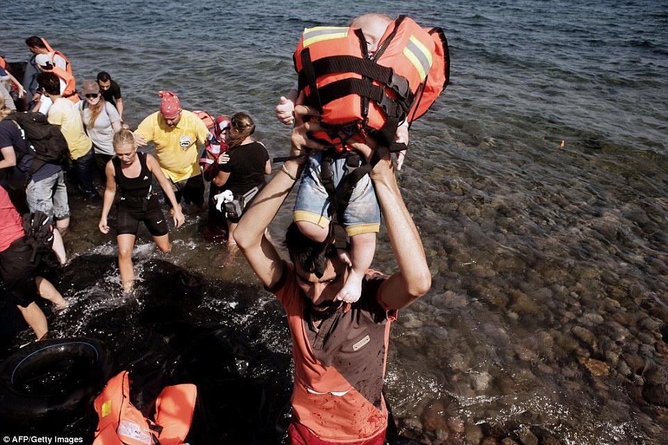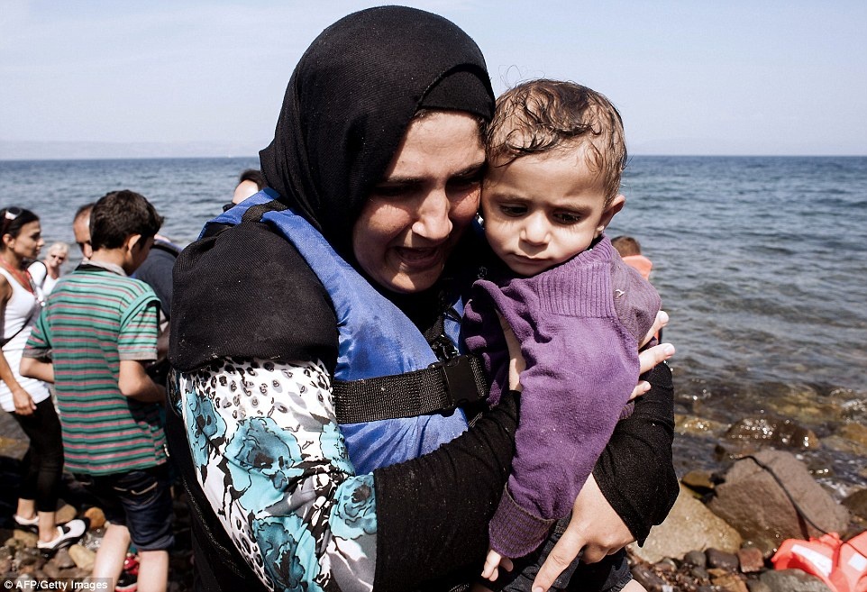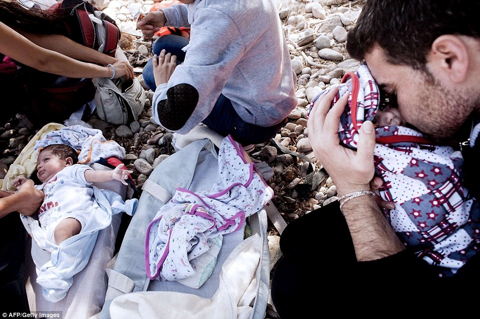 | Một người đàn ông Syria bế bé trai đeo áo phao khi nhóm người của họ vừa đến đảo Lesbos. Liên Hiệp Quốc cho biết tình hình nội chiến ở Syria khiến cuộc sống trở nên tồi tệ, buộc khoảng 4 triệu người rời khỏi đất nước để di cư sang các quốc gia khác. Ngày 20/9, Ngoại trưởng Mỹ John Kerry cho biết Mỹ sẽ tiếp nhận 85.000 người tị nạn trong 2 năm tới để chia sẻ gánh nặng với châu Âu. |