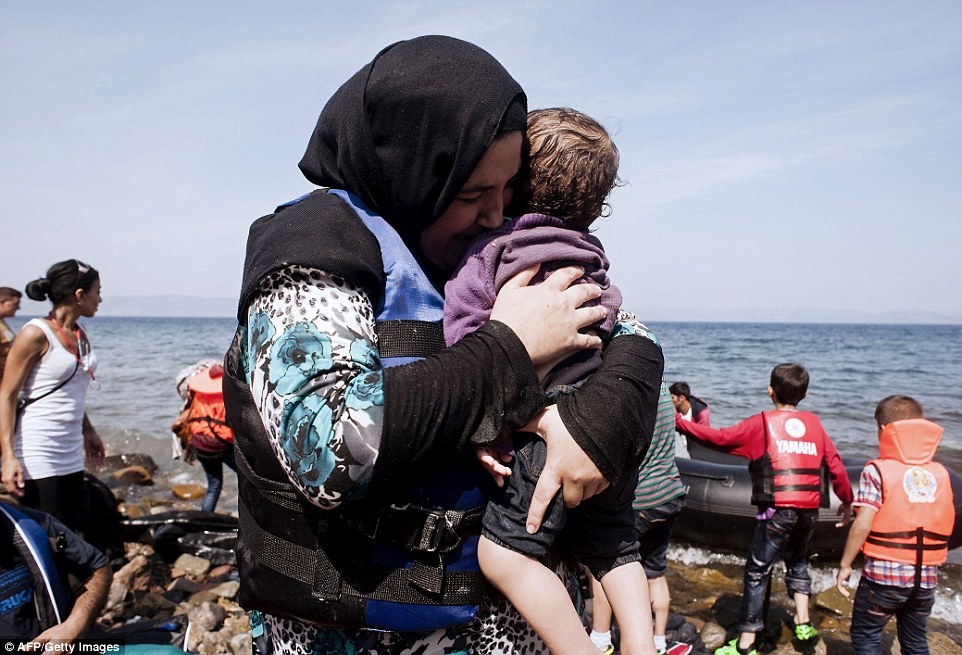 | Người mẹ ôm con trai sau khi họ từ Thổ Nhĩ Kỳ vượt biển an toàn để đến Hy Lạp, từ đó đi vào châu Âu. |