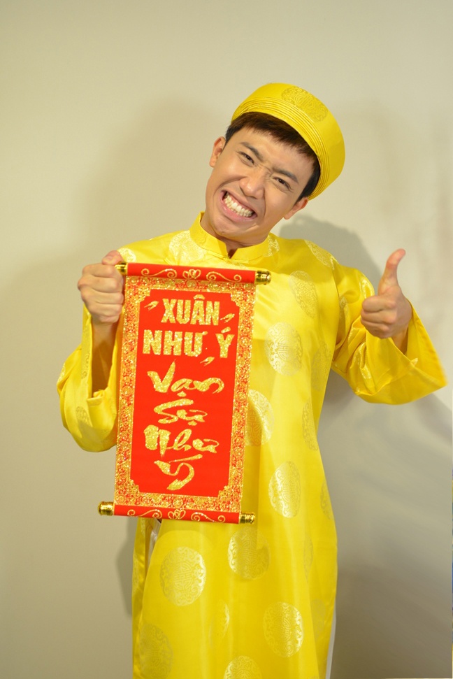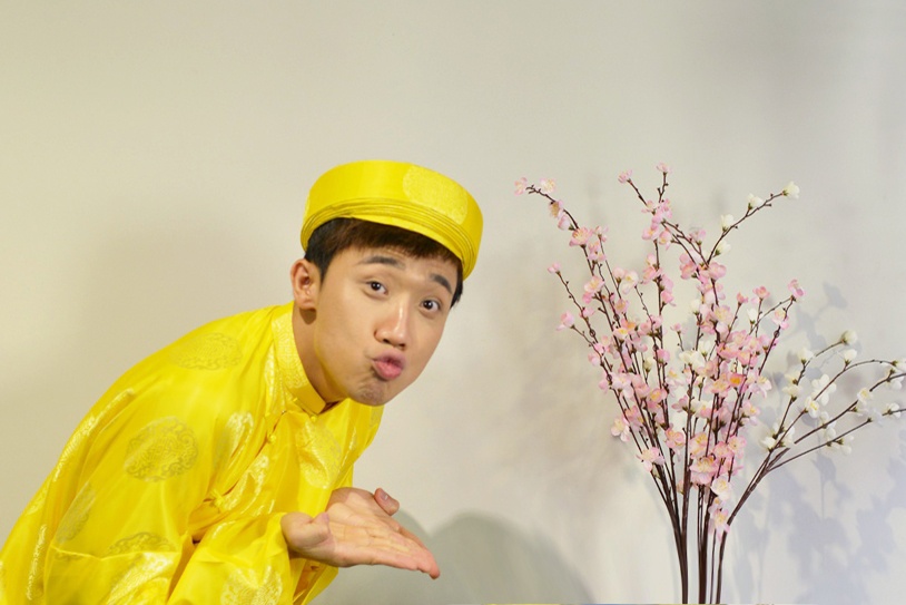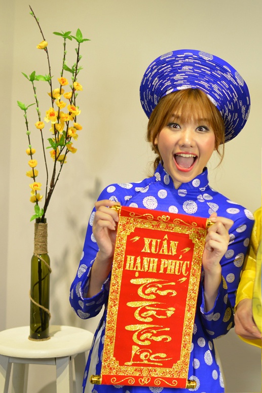 | Sau những màn đấu khẩu và đối đáp hài hước, cặp đôi trở nên thân thiết. Cả hai quyết định diện áo dài khăn đóng, nhí nhố tạo dáng bên mai đào và câu đối Tết, chúc mọi người một năm mới vuông tròn. Trong tà áo dài truyền thống của người Việt, Hari cùng Trấn Thành kết hợp đọc "rap" một bài vè chúc Tết khán giả nhân dịp đầu năm mới. |