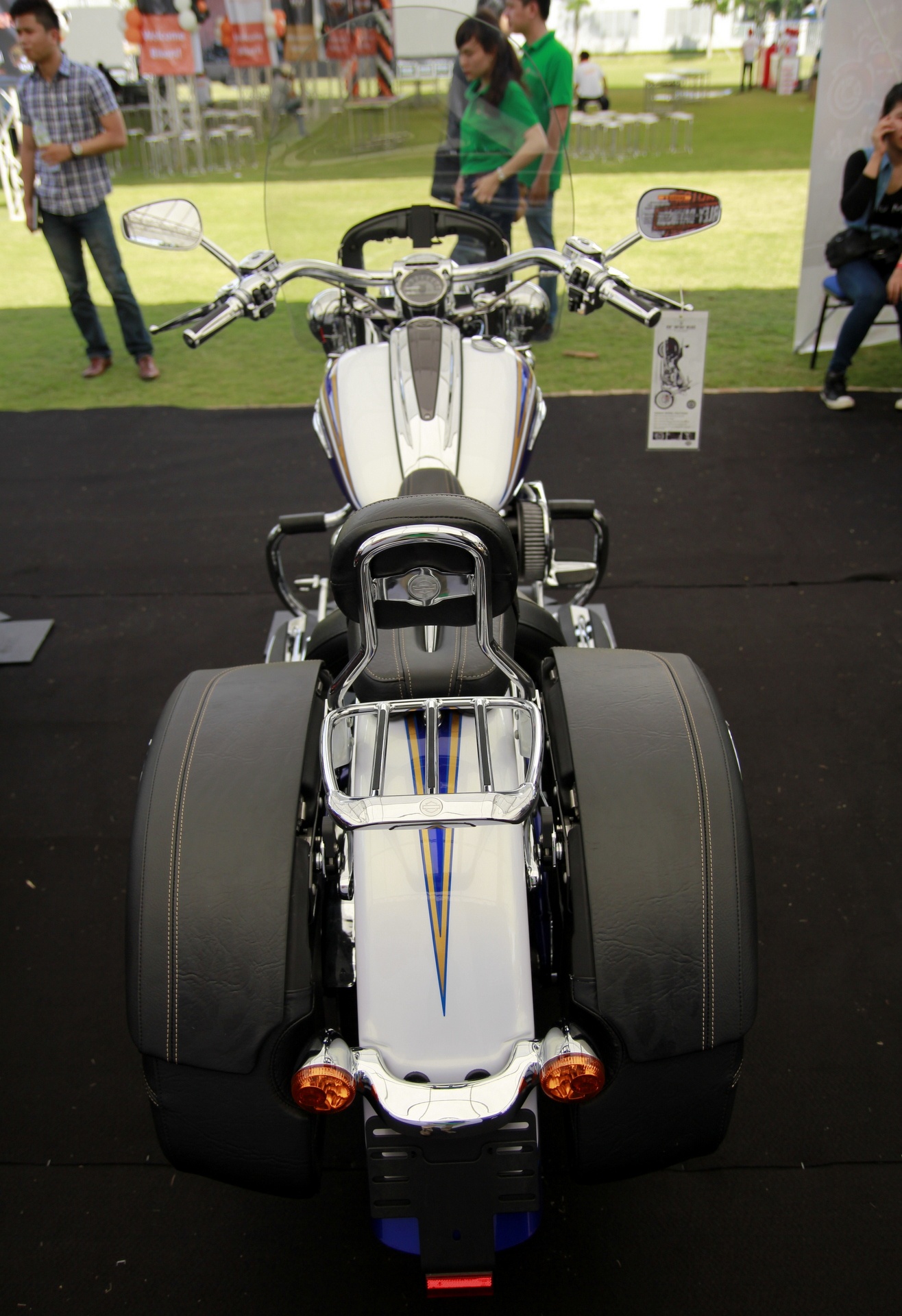| Nhìn từ phía sau, chiếc xe khá thấp, thoải mái trên đường trường. Đặc biệt, túi hành lý bằng da khâu tay ở hai bên giúp chủ nhân thoải mái chất đồ cho những chuyến đi xa. Chiều cao tới yên 655 mm, yên sau có dựa khiến người ngồi sau không bị mỏi lưng. |
