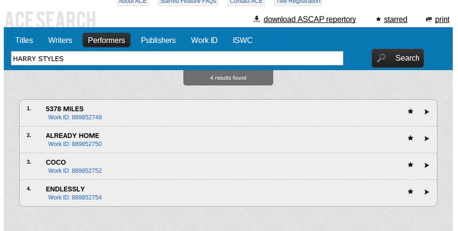 | Tên 4 ca khúc mới của Harry được thông báo trên website chính thức của ASCAP. |