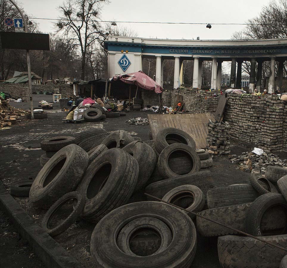 Lốp xe, gạch đá ngổn ngang tại quảng trường Độc lập, nơi cảnh sát chống bạo động Ukraina và người biểu tình chống chính phủ, đụng độ đẫm máu từ ngày 18/2 đến 20/2. Ảnh: Demotix.