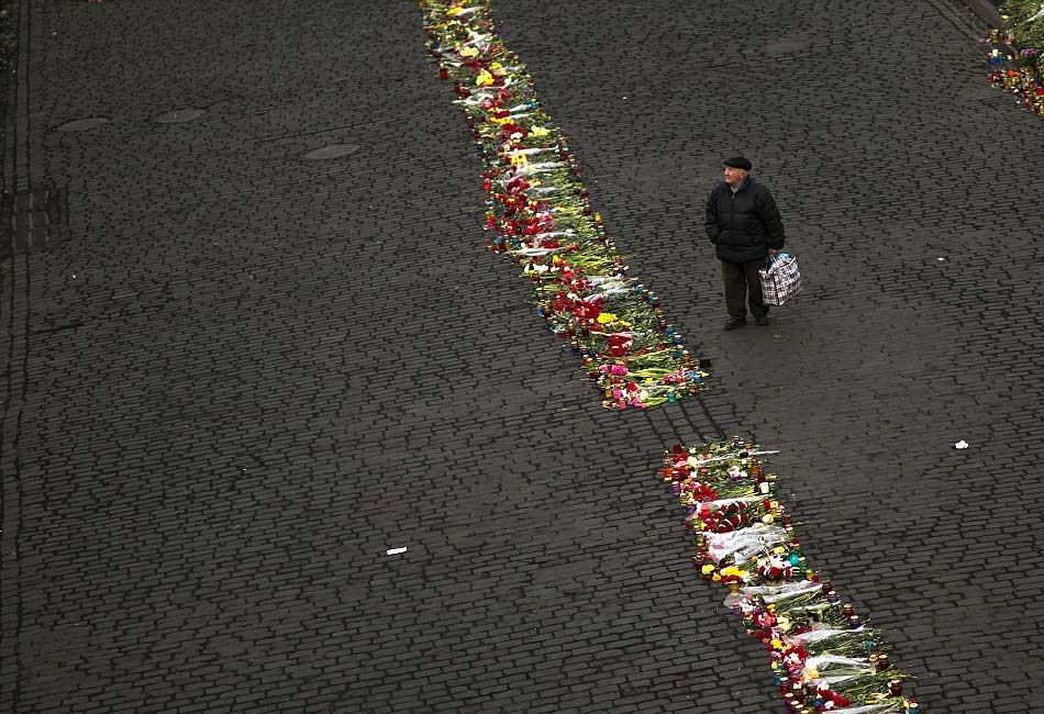 Hàng hoa dài ở quảng trường Độc lập. Ukraina đang trải qua những diễn biến phức tạp. Ảnh: AP.