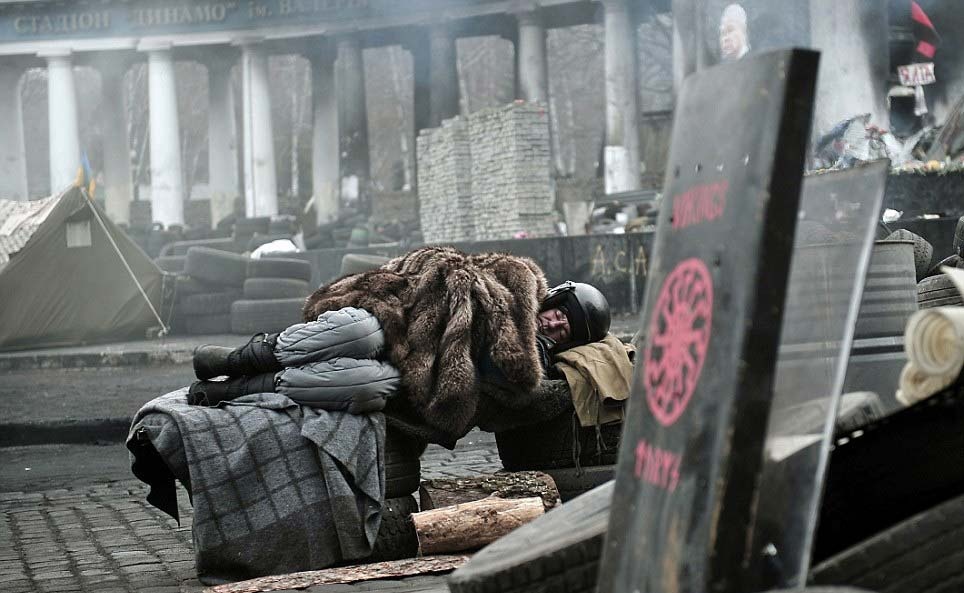 Người biểu tình ngủ gần sân bóng Dynamo ở Kiev. Quốc hội Ukraina ngày 27/2 phê chuẩn quyết định bổ nhiệm ông Arseny Yatseniuk - cựu bộ trưởng Kinh tế đồng thời là người ủng hộ Liên minh châu Âu (EU) - làm thủ tướng mới. Ảnh: Getty.
