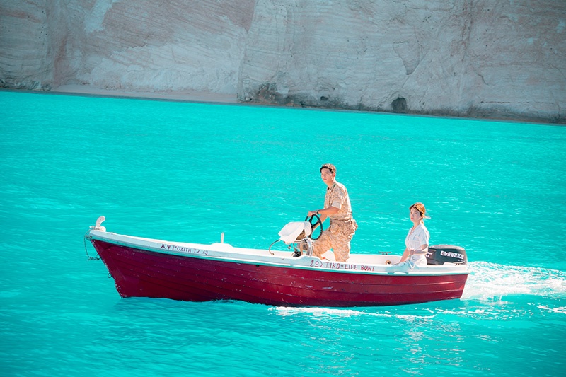 Màu nước xanh biếc của bãi biển ở Zakynthos làm phông nền hoàn hảo cho mối tình lãng mạn trong phim. Ảnh: Kbs. |