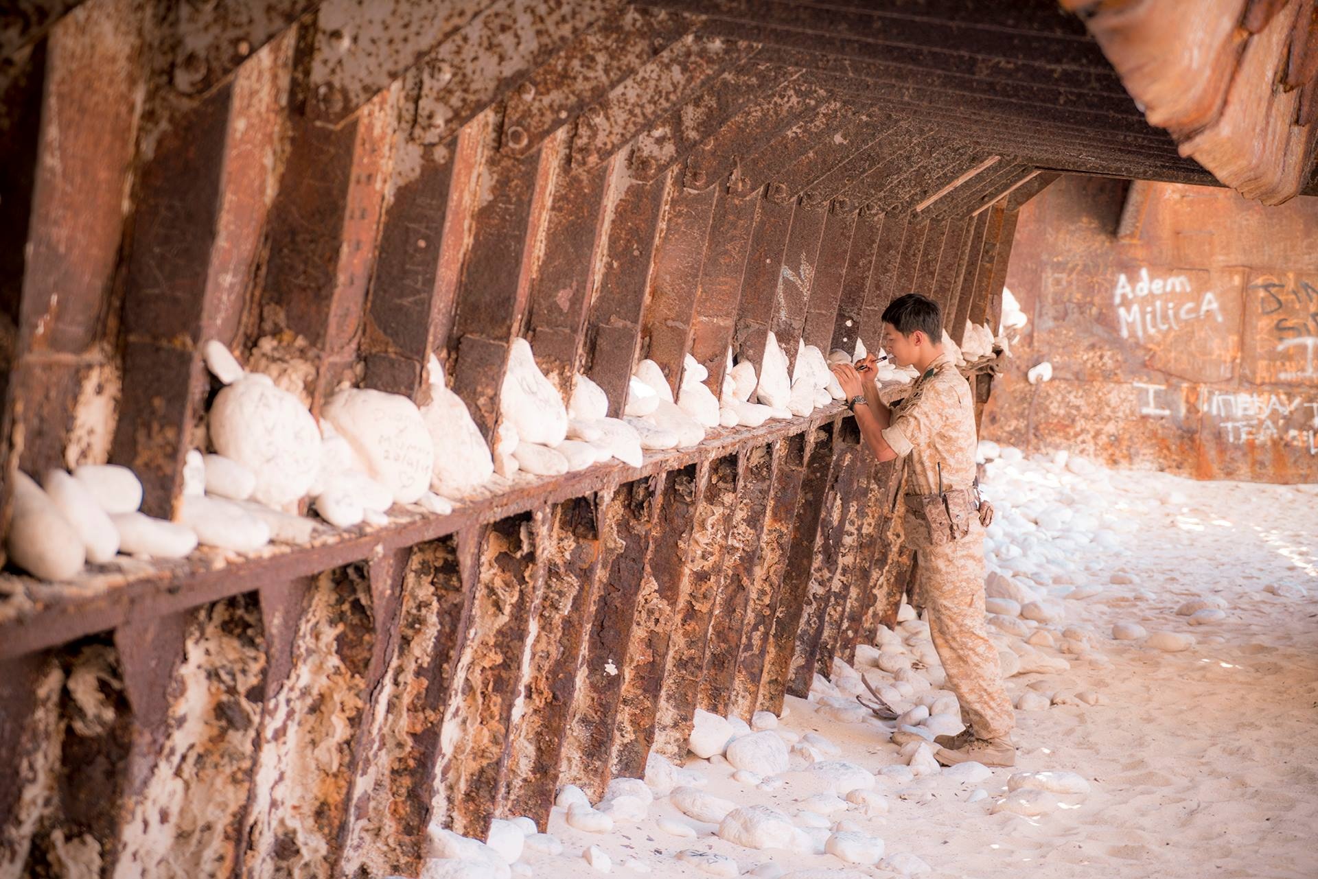 Nam diễn viên Song Joong Ki viết lên đá lưu niệm ở bãi Tàu Đắm. Ảnh: Soompi. |