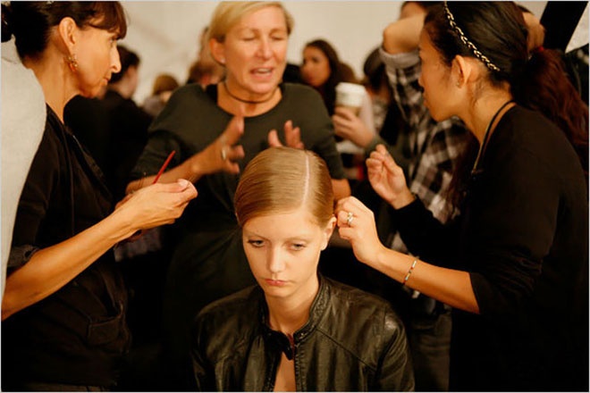 | Để hình dung một ngày làm việc của người mẫu vất vả và căng thẳng ra sao, bạn chỉ cần đột nhập vào hậu trường của bất kỳ sàn diễn quốc tế nào. Ấn tượng đầu tiên sẽ là choáng ngợp trong không khí nhốn nháo và căng thẳng của người mẫu vì phải tranh thủ thay trang phục, trang điểm trong thời gian nhanh nhất có thể. |