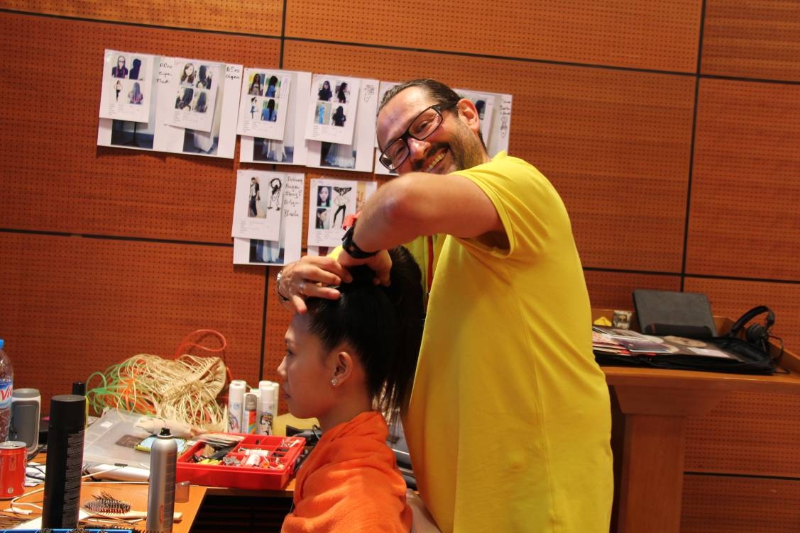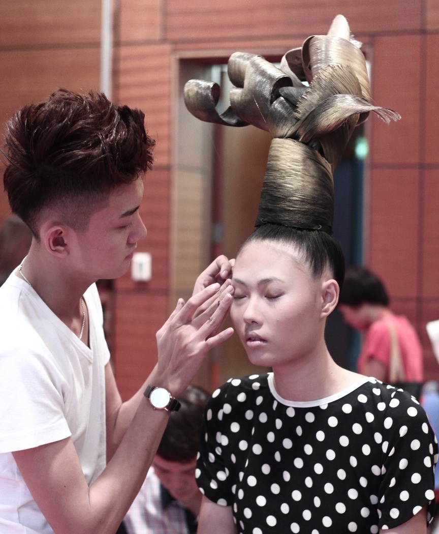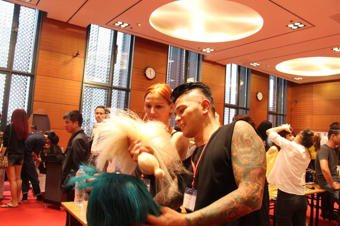 | Đại sứ Goldwell tại châu Á - Peter Wu - chuẩn bị tóc cho người mẫu. |