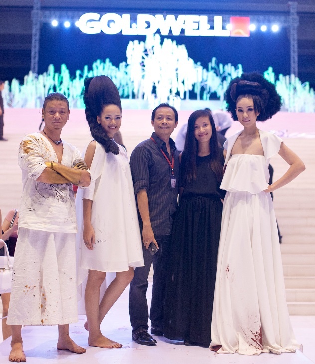 | Họa sỹ Trần Nhật Thăng (ngoài cùng bên trái), đạo diễn Phạm Hoàng Nam (chính giữa) bên cạnh nhà thiết kế thời trang Lê Hà cùng các người mẫu sau show diễn Họa Tình (Goldwell). |
