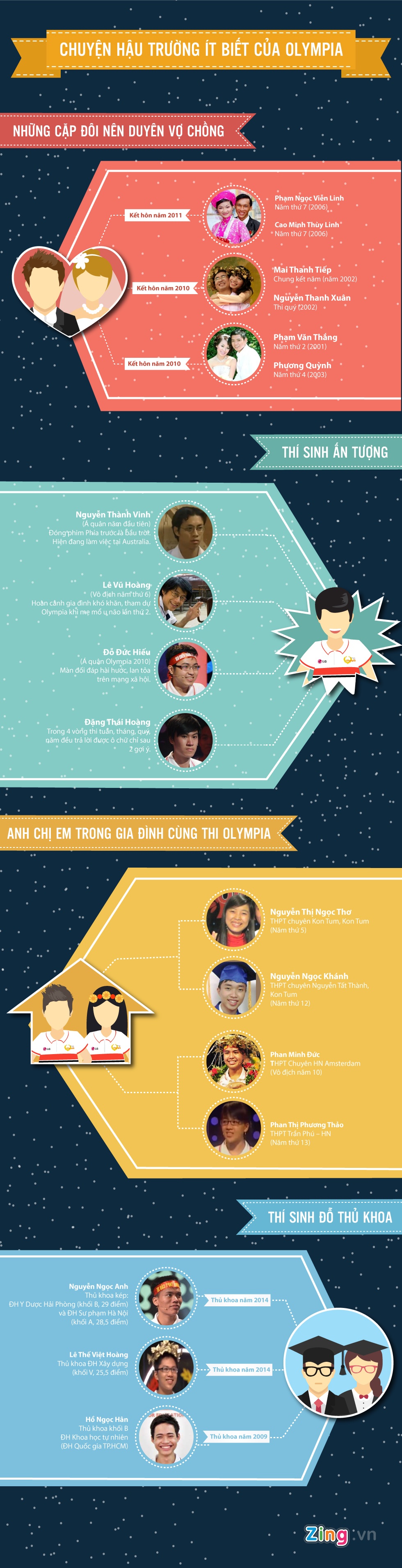Từ Đường lên đỉnh Olympia, đã có nhiều cặp đôi nên duyên vợ chồng, á quân đóng phim dài tập và nhiều chuyện bất ngờ khác xảy ra.