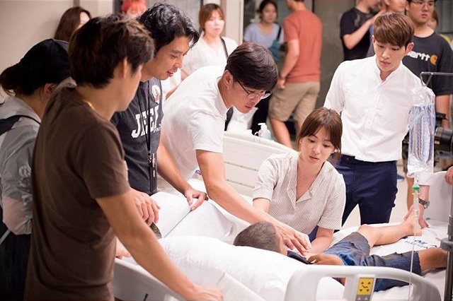 Hình ảnh hậu trường khác của đoàn phim khi nhân vật của Song Hye Kyo chuẩn bị phẫu thuật cho bệnh nhân. Mỹ nhân mặt mộc bàn bạc cụ thể với ê-kíp trước khi quay. |