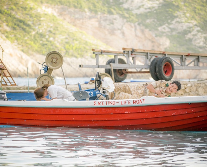 2 diễn viên cười thả ga trong một cảnh quay trên thuyền. Phân cảnh này là buổi dạo chơi ngoài đảo lãng mạn của hai nhân vật Yoo Shi Jin và Kang Mo Yeon. |