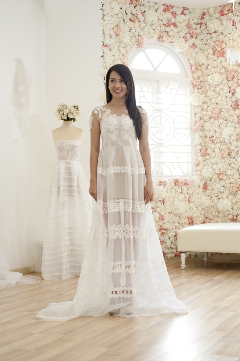 BST áo cưới của Trương Thanh Hải có chất liệu chủ đạo là ren và lưới mỏng. Sự hòa trộn giữa hai chất vải này mang đến vẻ mềm mại, duyên dáng cho những cô dâu nữ tính.